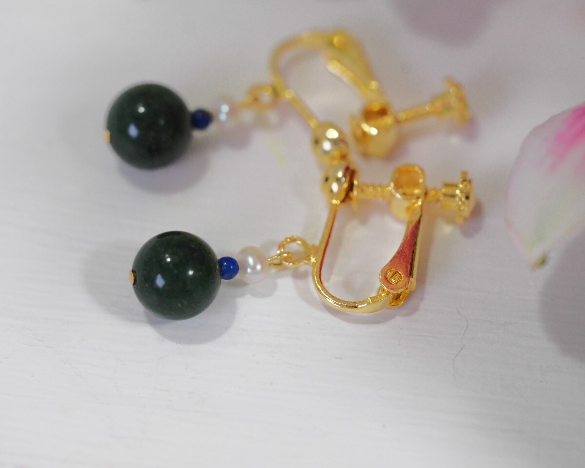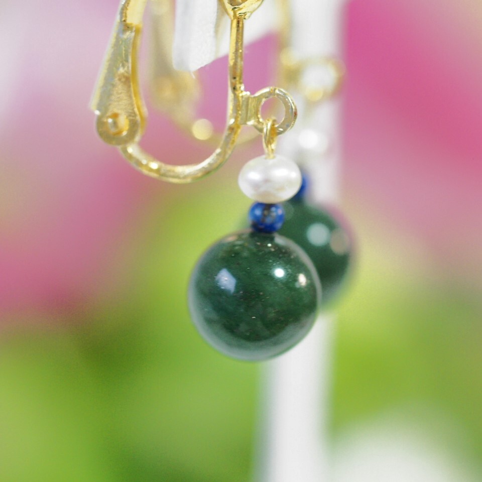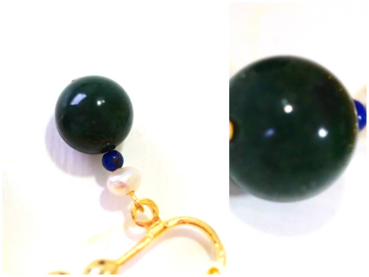 こちらは天然インド翡翠にホワイト淡水真珠、ラピスラズリを組合わせたイヤリングです。
