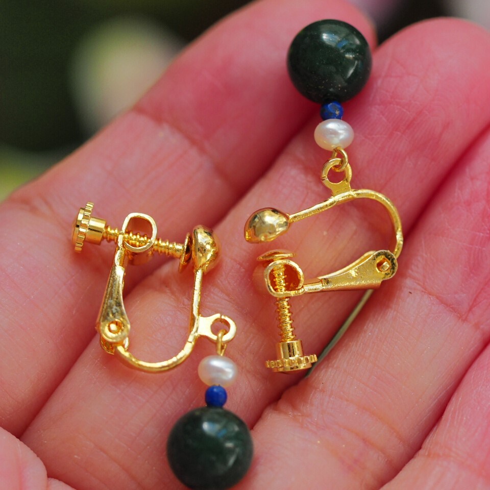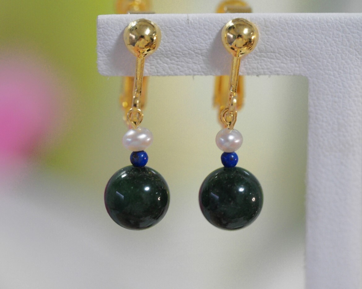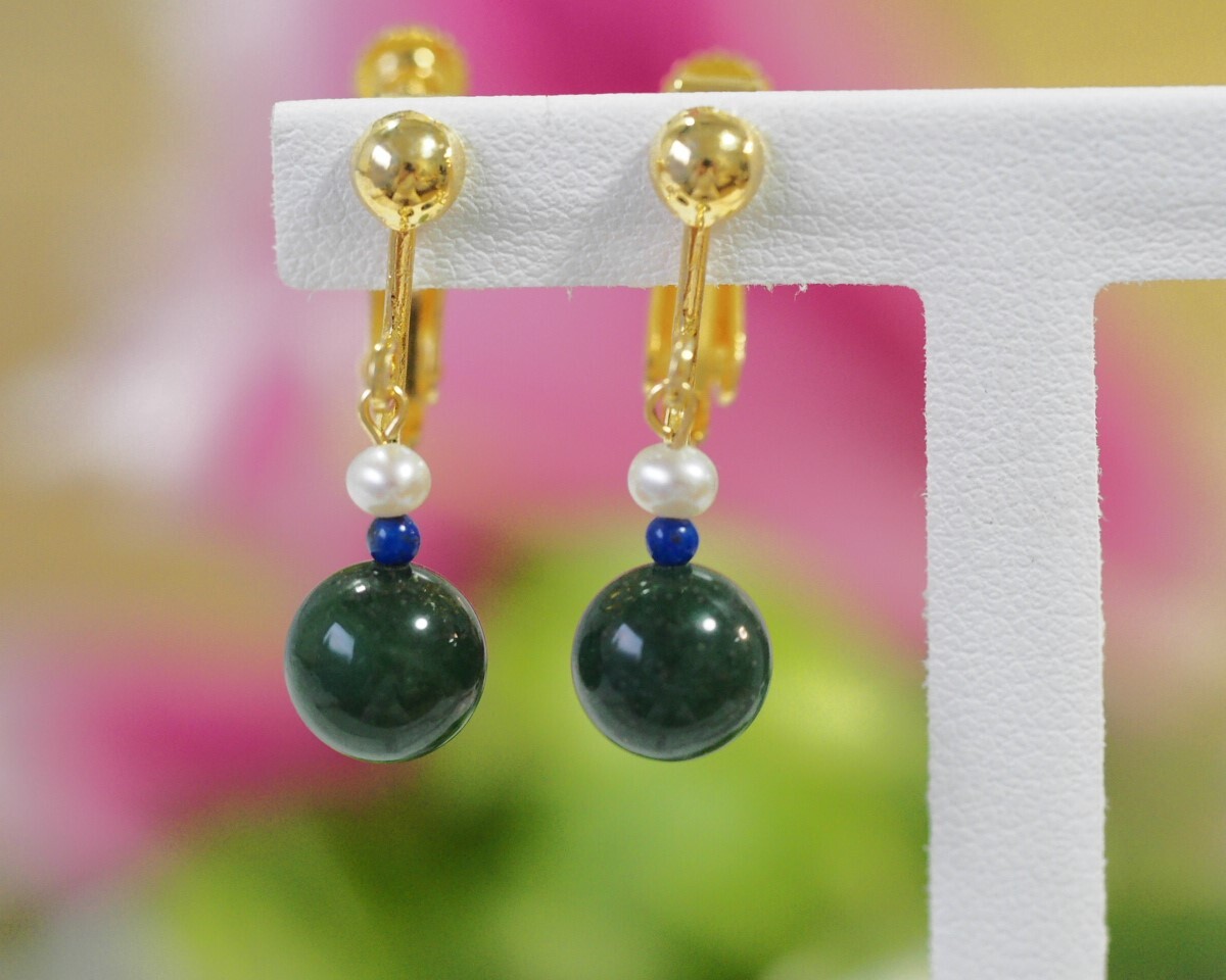 こちらは天然インド翡翠にホワイト淡水真珠、ラピスラズリを組合わせたイヤリングです。