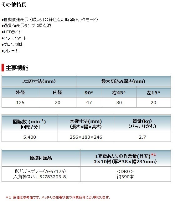 ・1充電あたりの作業量(目安) 2×10材(厚さ38×幅235mm):約390本(BL1860B)