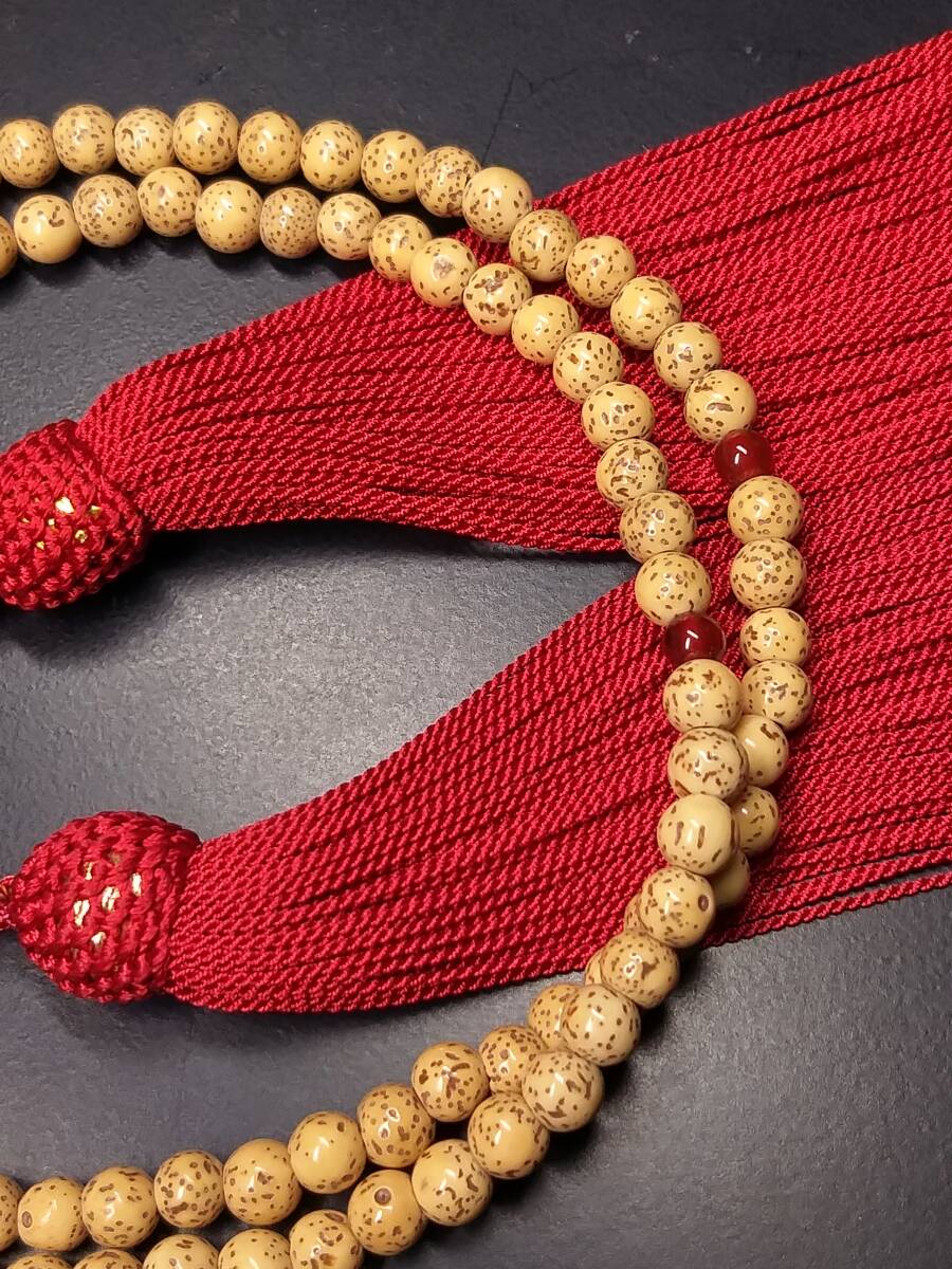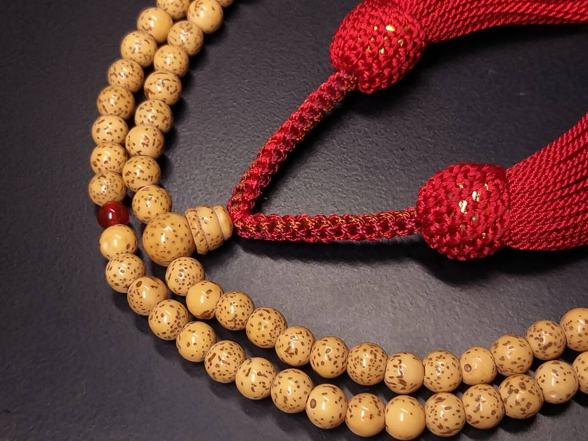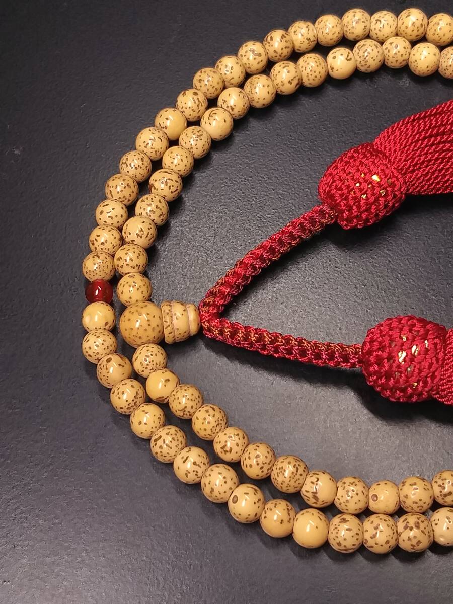 この数珠に使用されている主玉は、天然最高級極珍品野生雲珠形超小108粒インド星月白菩提(老実)の玉です。三粒天玉に使用されている珠玉は、天然最高級極品超小粒紅瑪瑙の玉です。親玉に使用されている珠玉は、天然最高級極珍品野生大粒インド星月白菩提(老実)の玉です。ボサに使用されている珠玉は、天然最高級極珍品野生超小粒インド星月白菩提(老実)の玉です。数珠の全体には、贅沢にも天然最高級極珍品野生雲珠形超小粒インド星月白菩提(老実)が全てに使用されています。使用されている房は、日本製の最高級正絹頭房です。京都の京都数珠製造卸協同組合で、直接購入した品です。