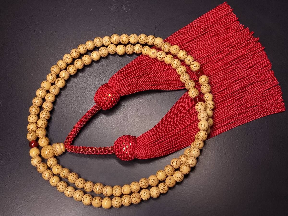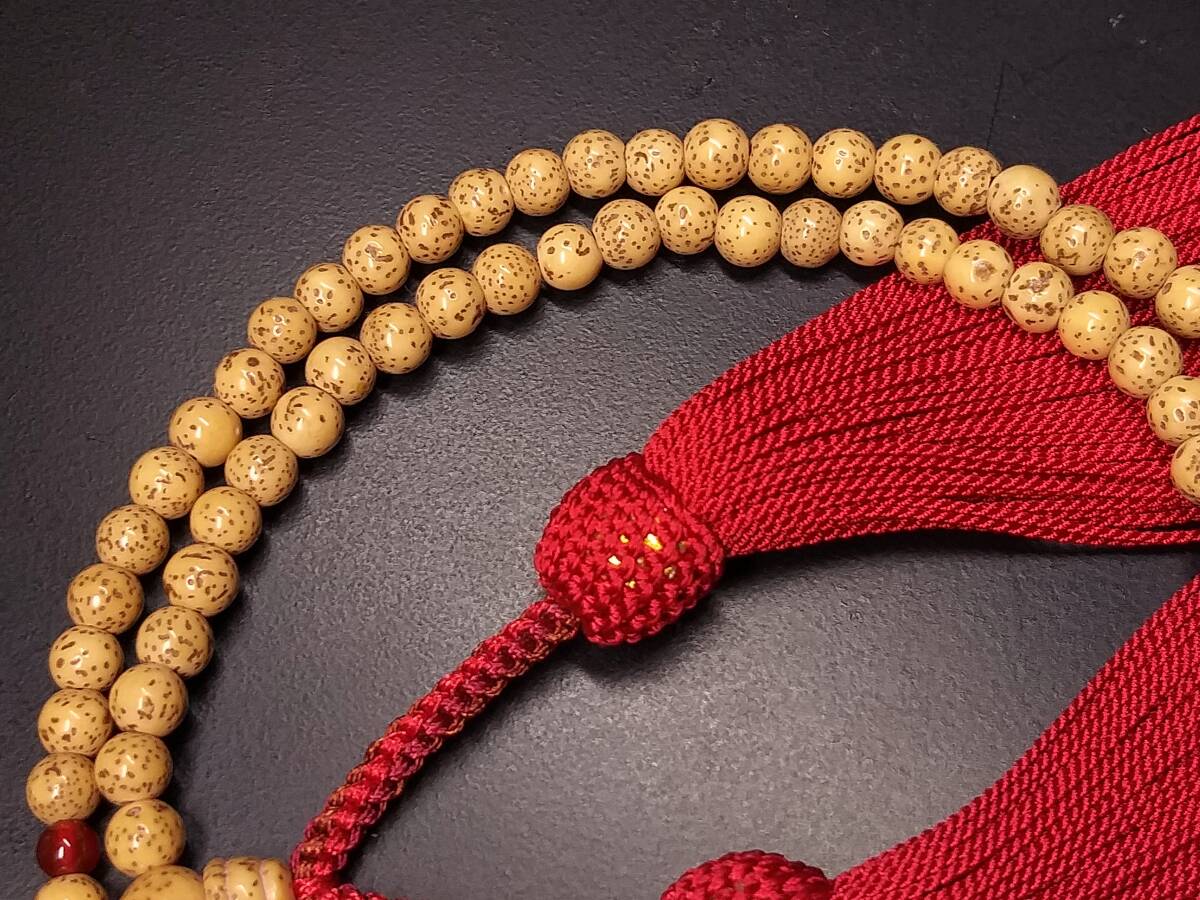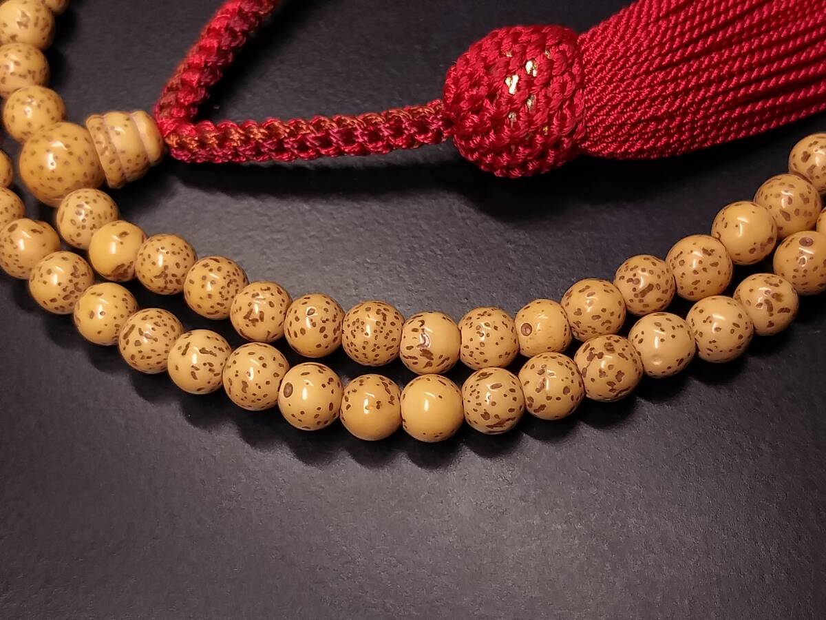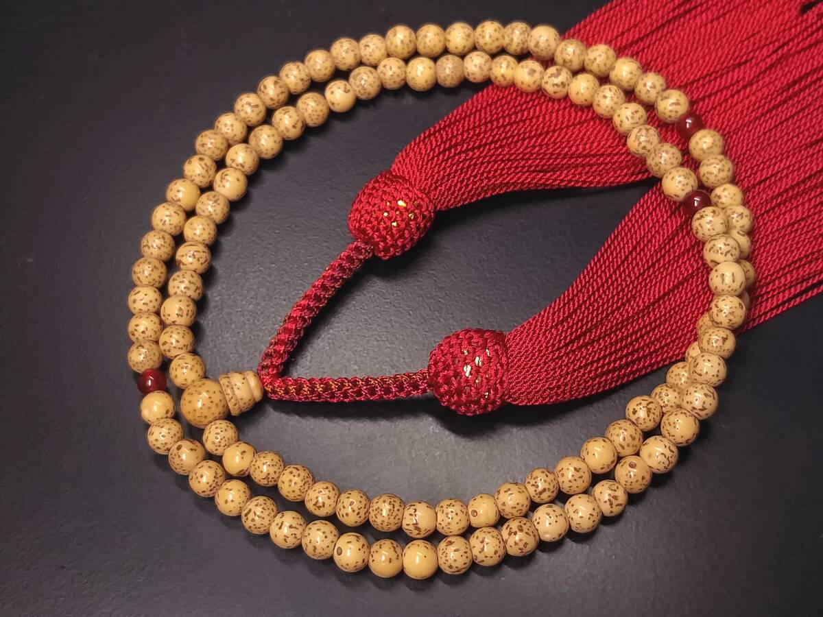 この数珠に使用されている主玉は、天然最高級極珍品野生雲珠形超小108粒インド星月白菩提(老実)の玉です。三粒天玉に使用されている珠玉は、天然最高級極品超小粒紅瑪瑙の玉です。親玉に使用されている珠玉は、天然最高級極珍品野生大粒インド星月白菩提(老実)の玉です。ボサに使用されている珠玉は、天然最高級極珍品野生超小粒インド星月白菩提(老実)の玉です。数珠の全体には、贅沢にも天然最高級極珍品野生雲珠形超小粒インド星月白菩提(老実)が全てに使用されています。使用されている房は、日本製の最高級正絹頭房です。京都の京都数珠製造卸協同組合で、直接購入した品です。