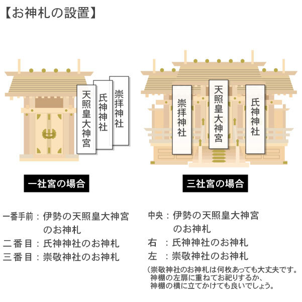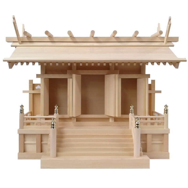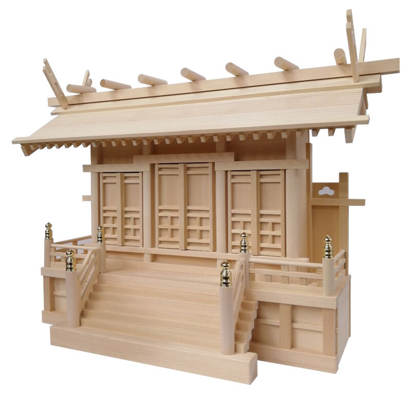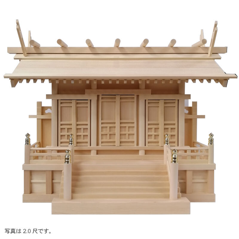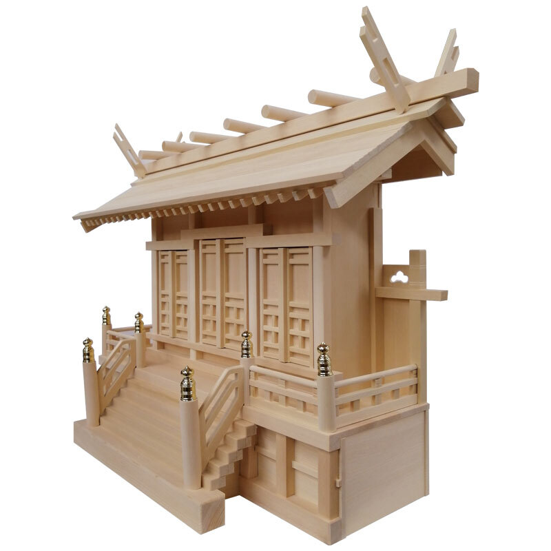 商品説明 | 【商品番号:2120】 ■商品詳細 【2.5尺】205,700円 ・外寸法:高さ約54cm×巾約84cm×奥行約26.5cm ・内部寸法:高さ約30cm×幅約42cm×奥行約8cm ■備考 ・商品は手作りの為、一部の色、デザイン、寸法が多少変更になる場合がございます。 屋根がひとつですっきりとしたデザインの通し屋根三社です。 正面の扉は開け閉めができ、お神札が納めやすいように屋根全体を上に持ち上げて屋根を外すことも出来ますので御札を納める際に便利です。 屋根の左右の千木は差し込み式で、社の回廊部分は三段の組高欄(くみこうらん)造りとなっております。 扉のデザインは手の込んだ唐戸でご用意致しました。扉が開け閉め出来ます。 お札の納め方は、中心に「天照皇大神宮」向かって右側に「氏神様」左側に「崇敬神」と言う順でお納めします。 | |