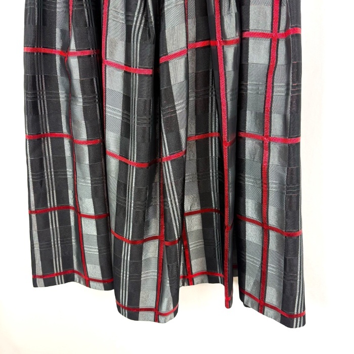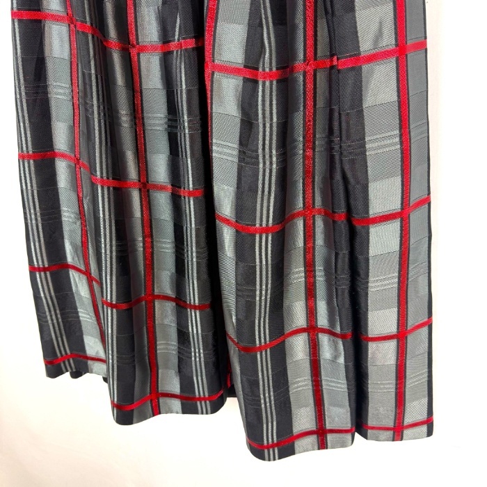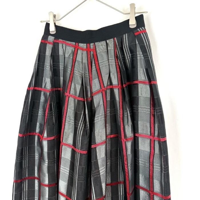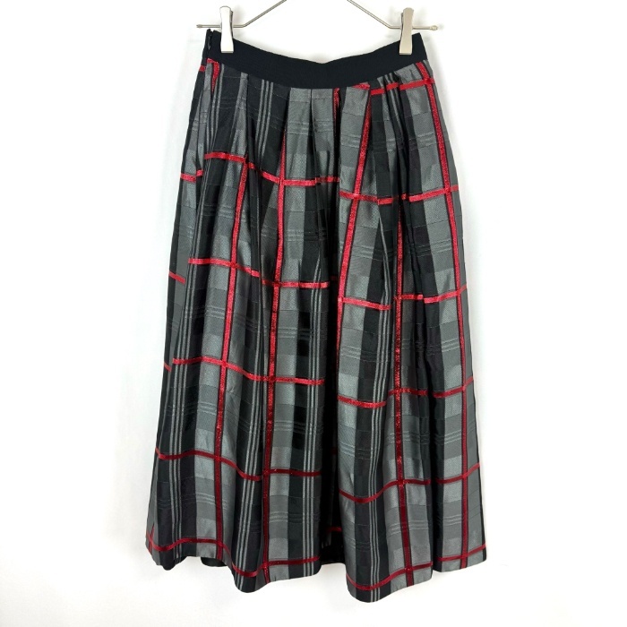 【コメント】 グレー地に赤いラメラインが映える素敵なチェック柄ロングスカートです。ふんわり可愛いシルエット。毛羽立ち、毛玉が少々ありますが、気になる汚れはなく全体的に綺麗なお品物です。 |