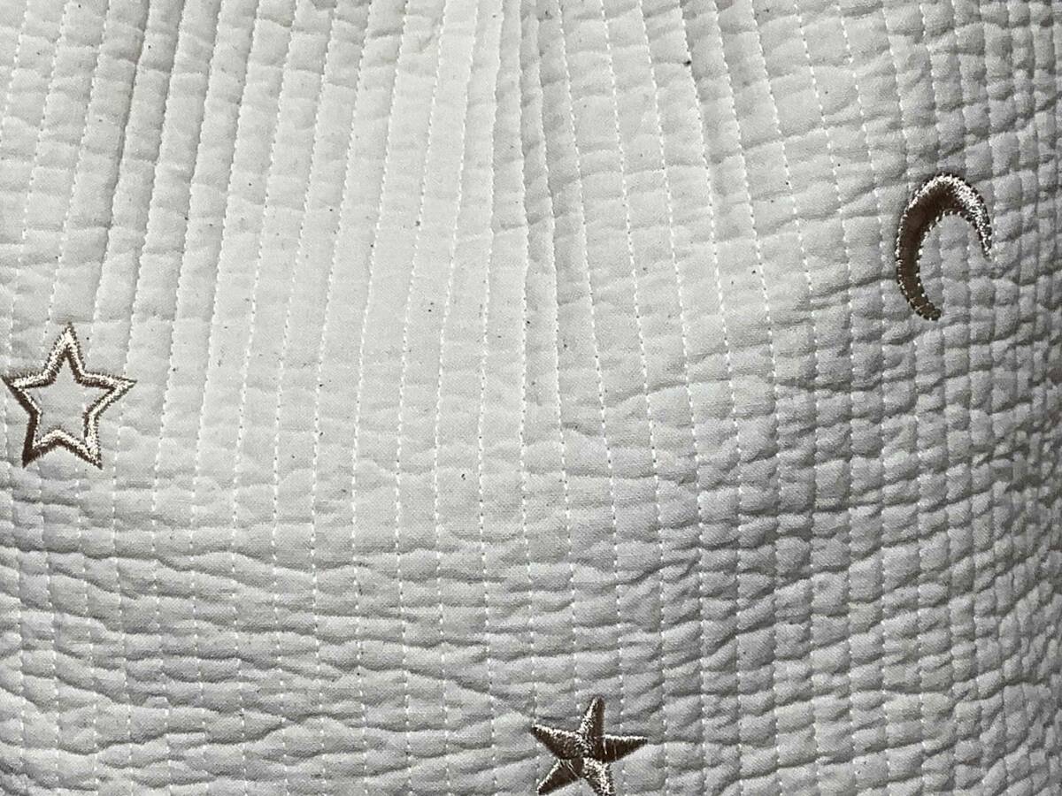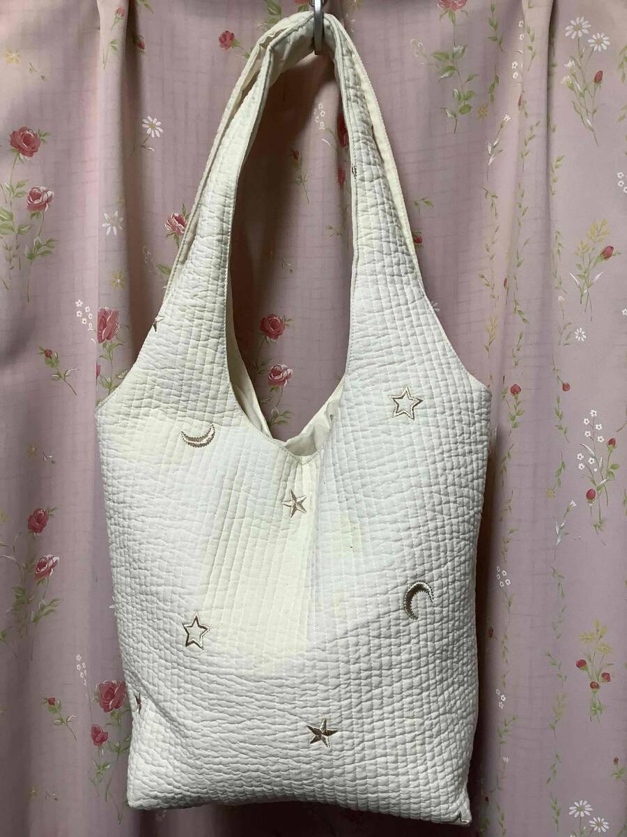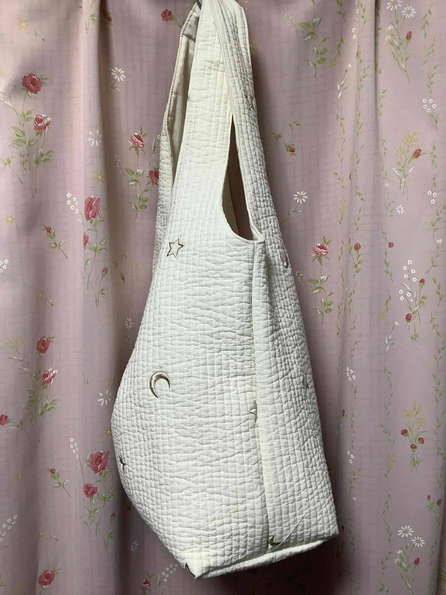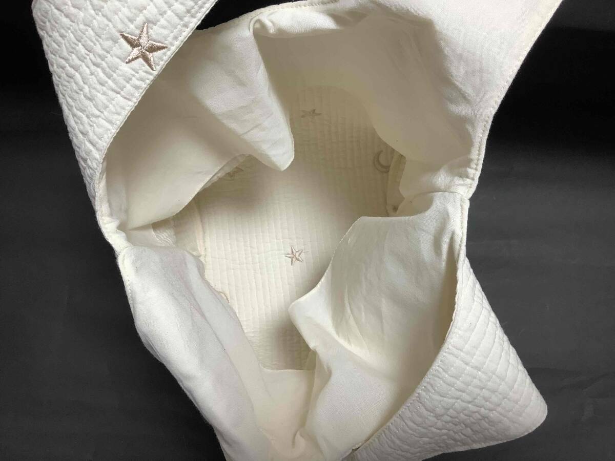 取っ手一体型のショルダーバックで、白のヌビ生地に三日月と星の刺繍が入った可愛いバックです。