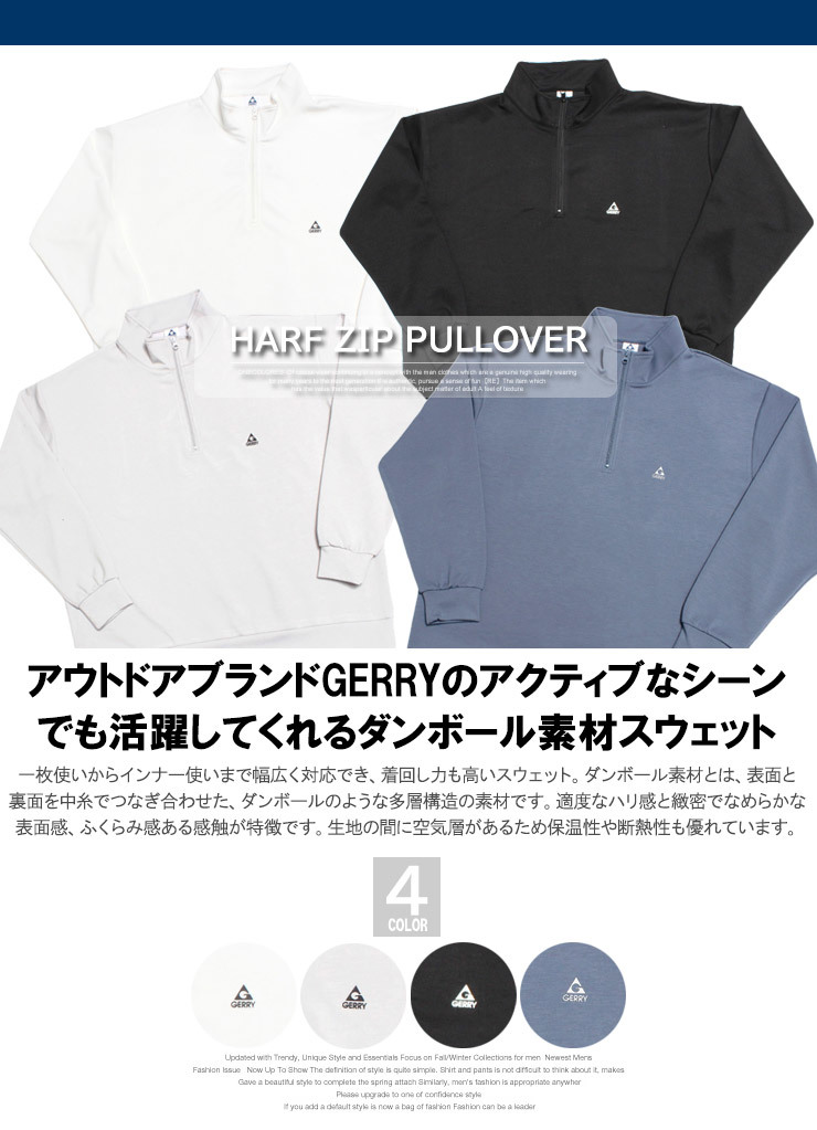 商品説明 | アウトドアブランドGERRYのアクティブなシーンでも活躍してくれるダンボール素材を使用したロゴプリントハーフジップスウェットトレーナーの登場です。 |