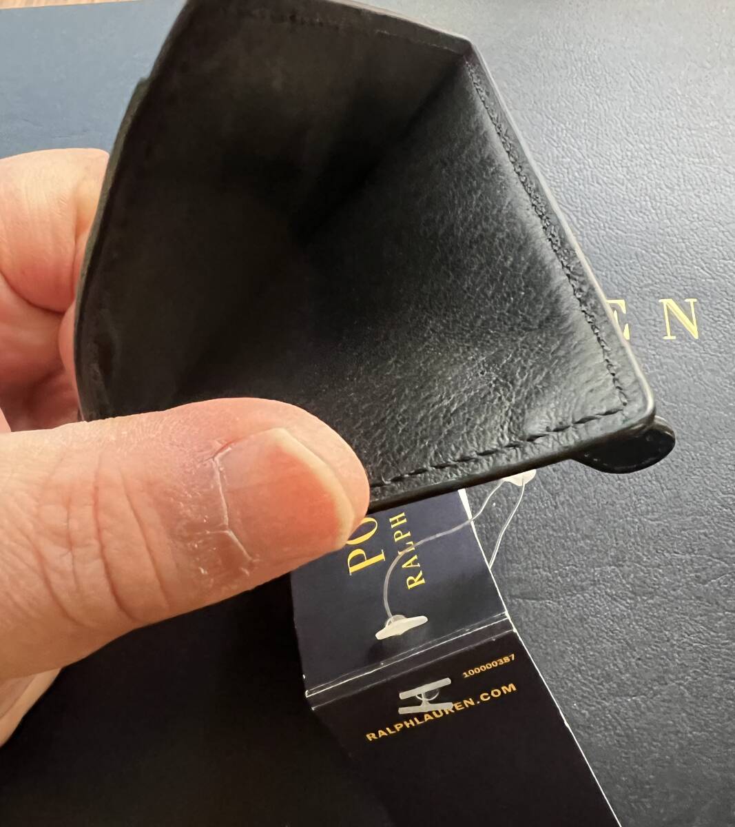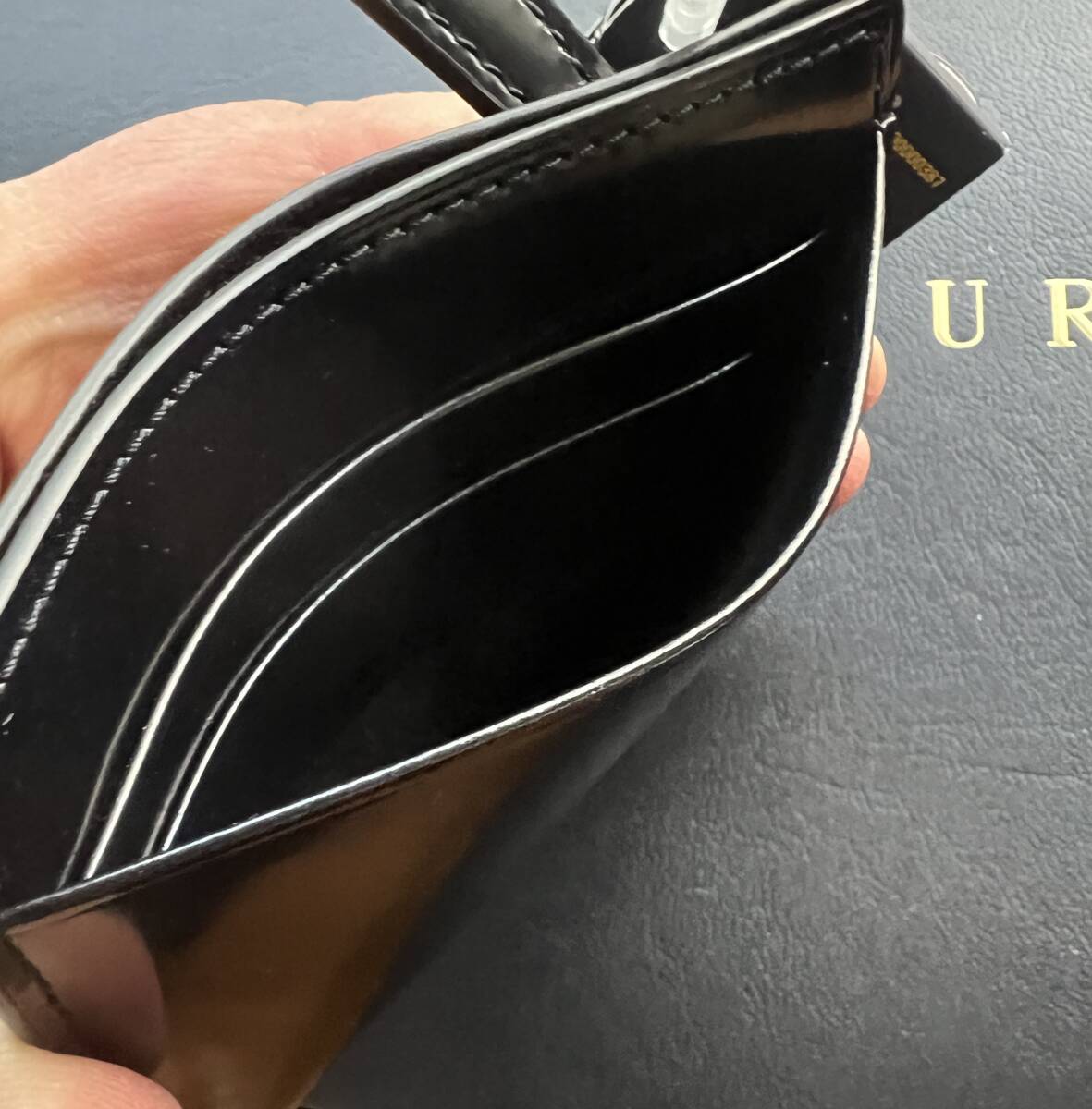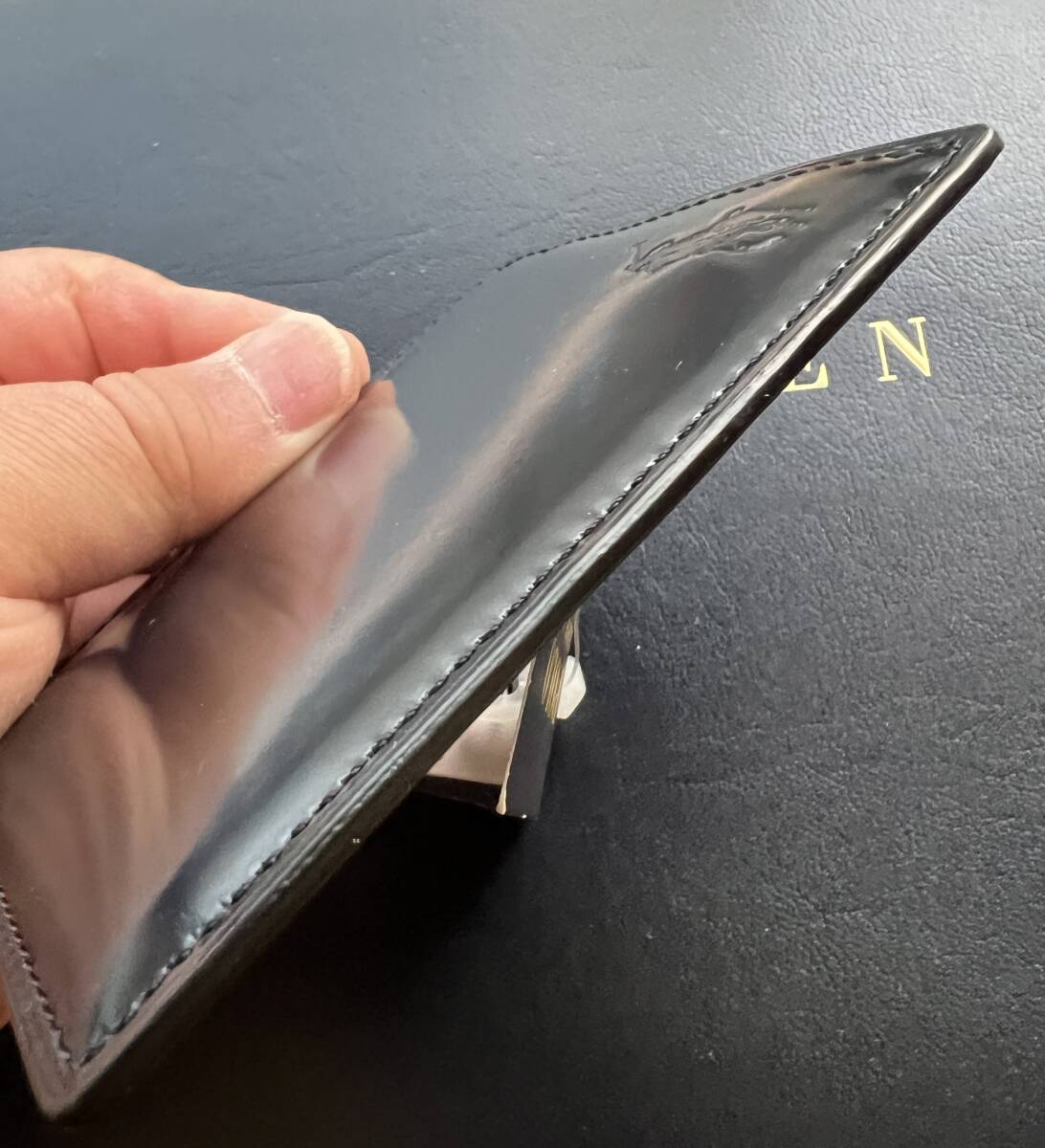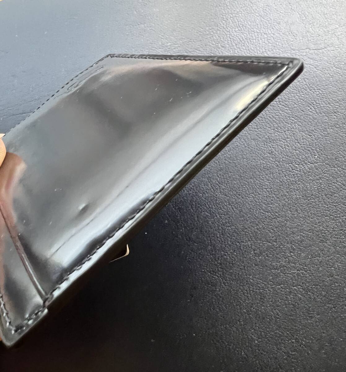 こんな拘りの、RALPH LAUREN カーフレザー 100% 濃紺パテントレザーxエナメル加工 & ブラックカーフレザー・ライナー 小銭入れ付き仕様 最高級 コンパクト・ウォレットを持ってお洒落を決めて街を闊歩したいものです。
