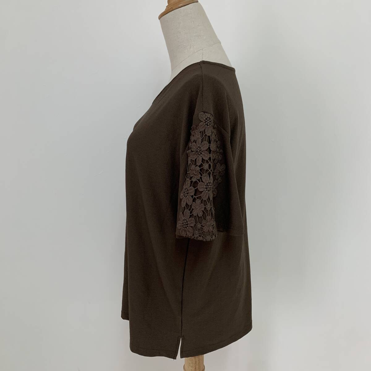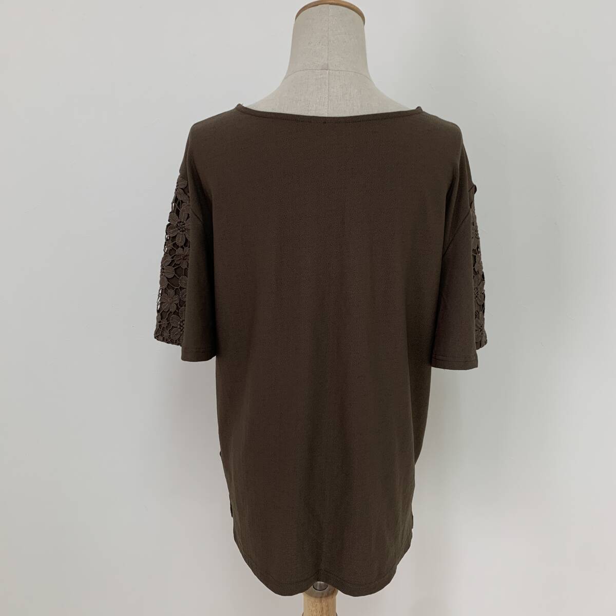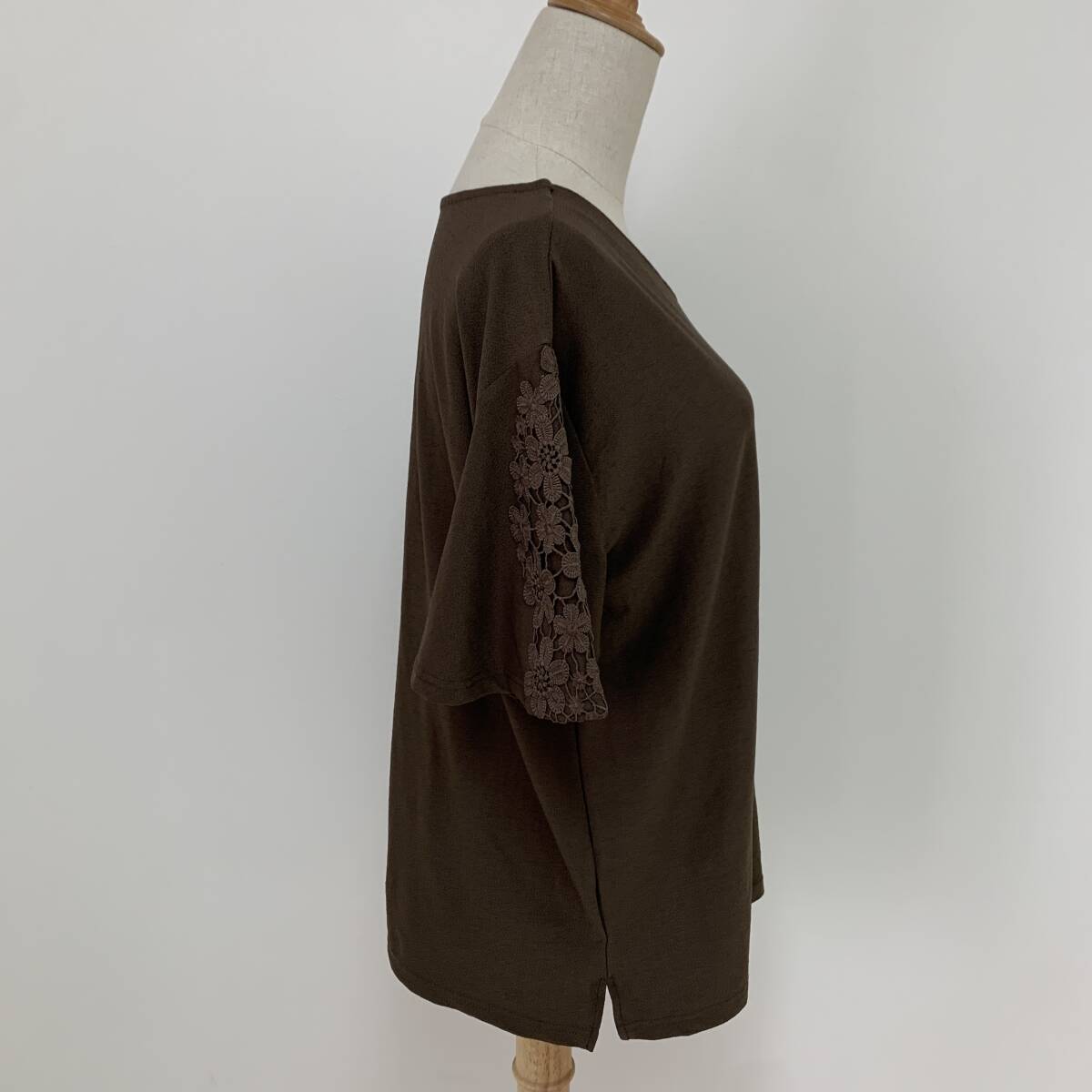 YH2178 HK WORKS LONDON レディース 半袖 シャツ レース ブラウス 茶 サイドスリット LLサイズ 薄手 大きめサイズ 万能 USED 古着