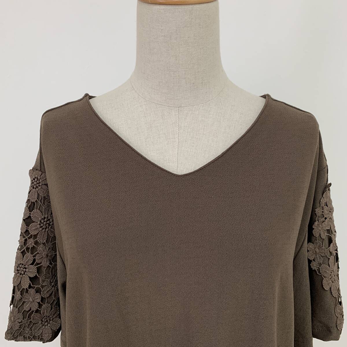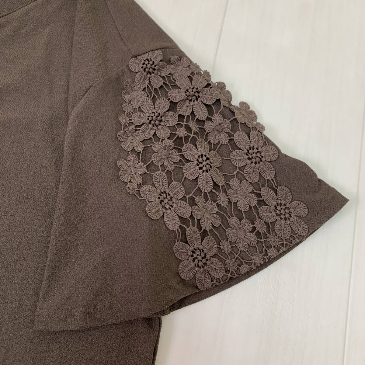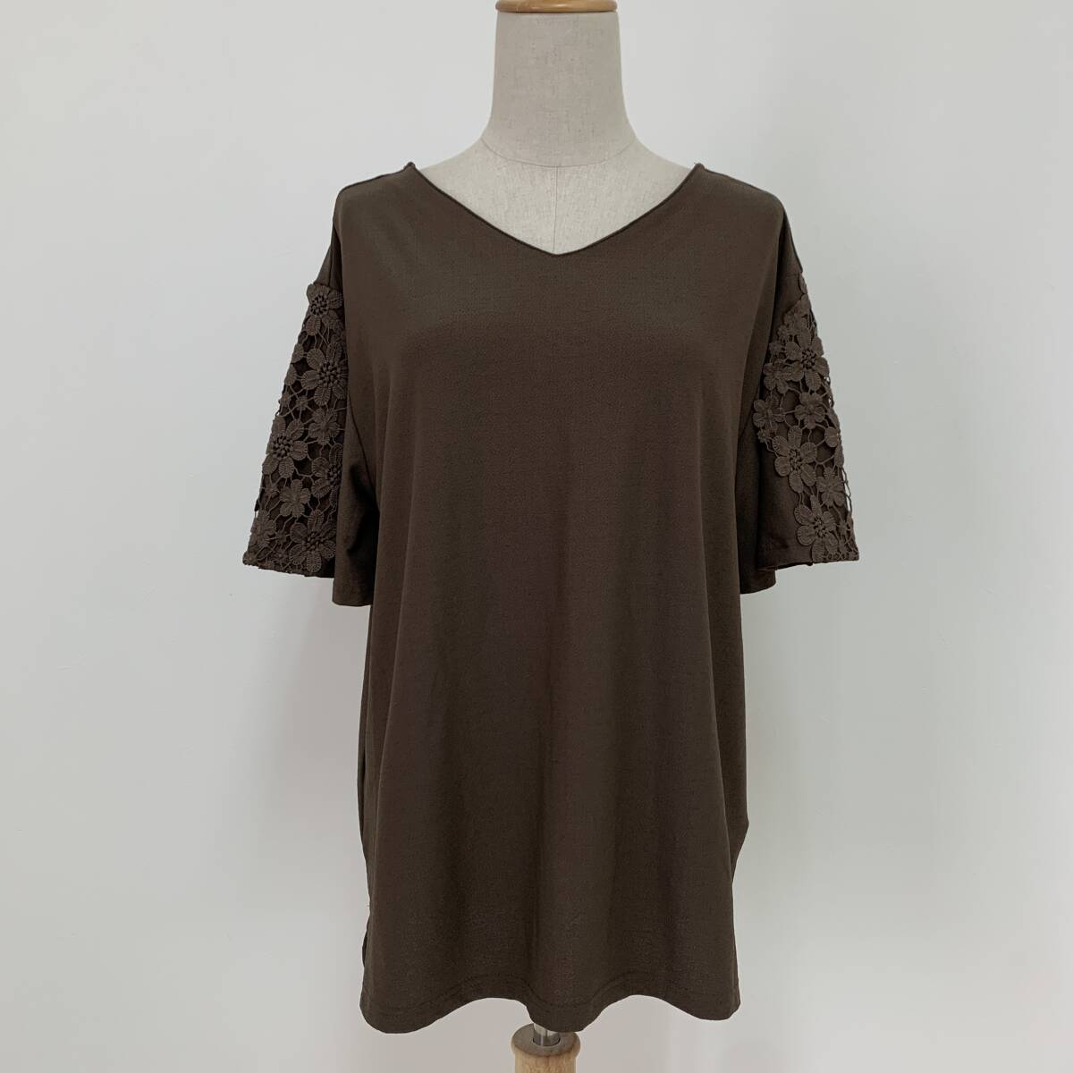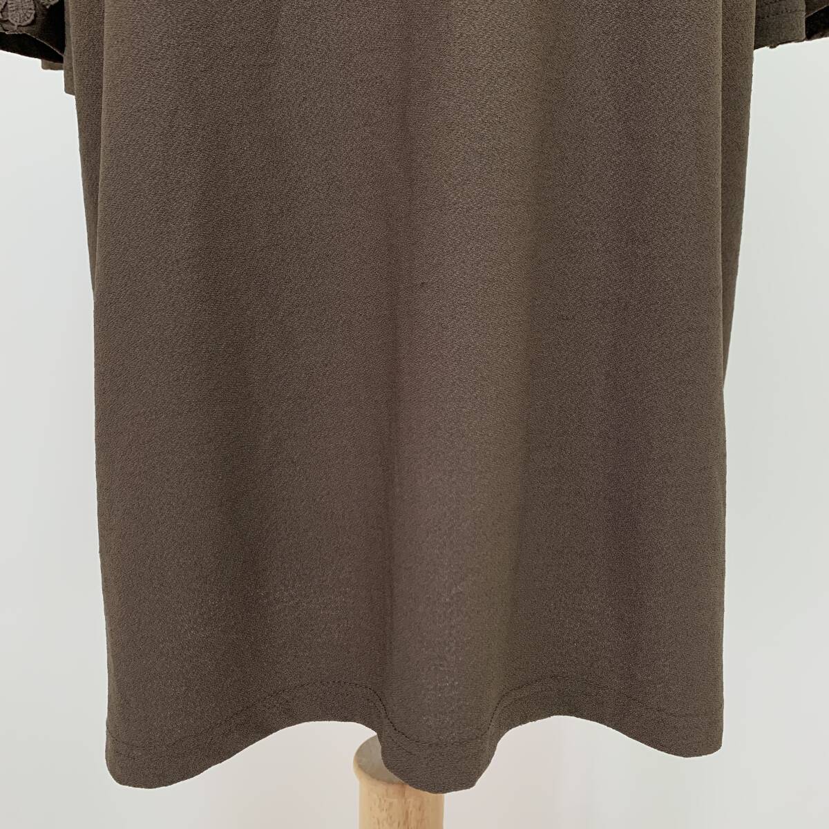 YH2178 HK WORKS LONDON レディース 半袖 シャツ レース ブラウス 茶 サイドスリット LLサイズ 薄手 大きめサイズ 万能 USED 古着