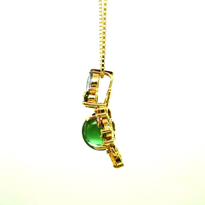 大きなカボッションカットのグリーントルマリンの周囲に花のような感じでラウンドやペアシェイプ・オーバルシェイプのカラートルマリンを配置。