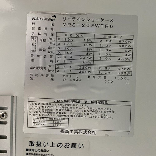 【業界最長1年保証】冷凍リーチインショーケース フクシマガリレイ(福島工業) MRS-20FWTR6 業務用 中古/送料別途見積