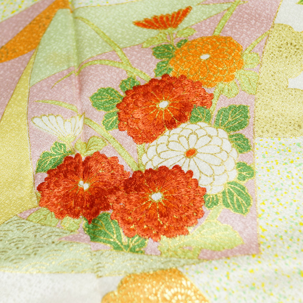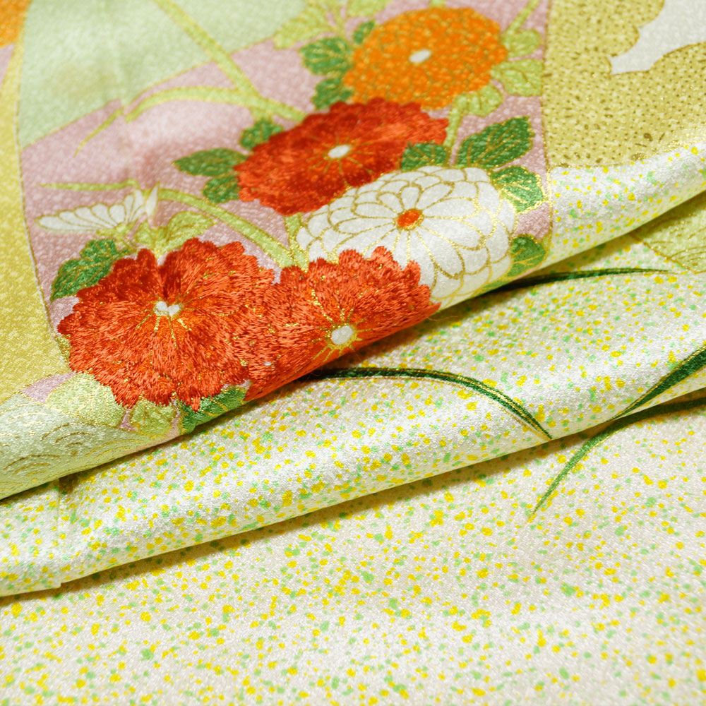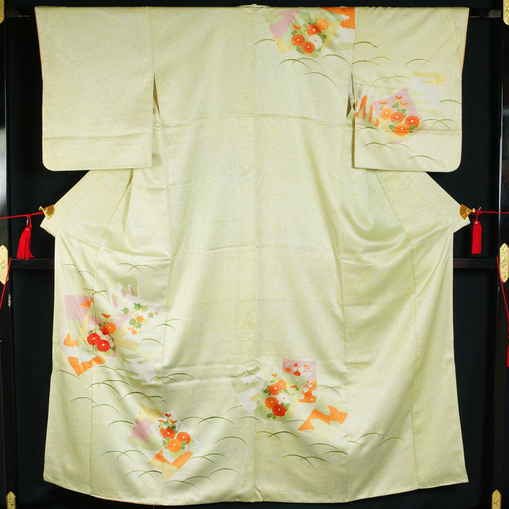 | 品 名 | 着物セット 付下げ訪問着・袋帯 2点 セット 色紙に芝草、菊模様 Sサイズ 【中古 付下げ 訪問着 中古 付け下げ 訪問着 セット 中古 リサイクル着物 ちりめん 付下げ 正絹 着物 訪問着 購入 販売 】 | ||