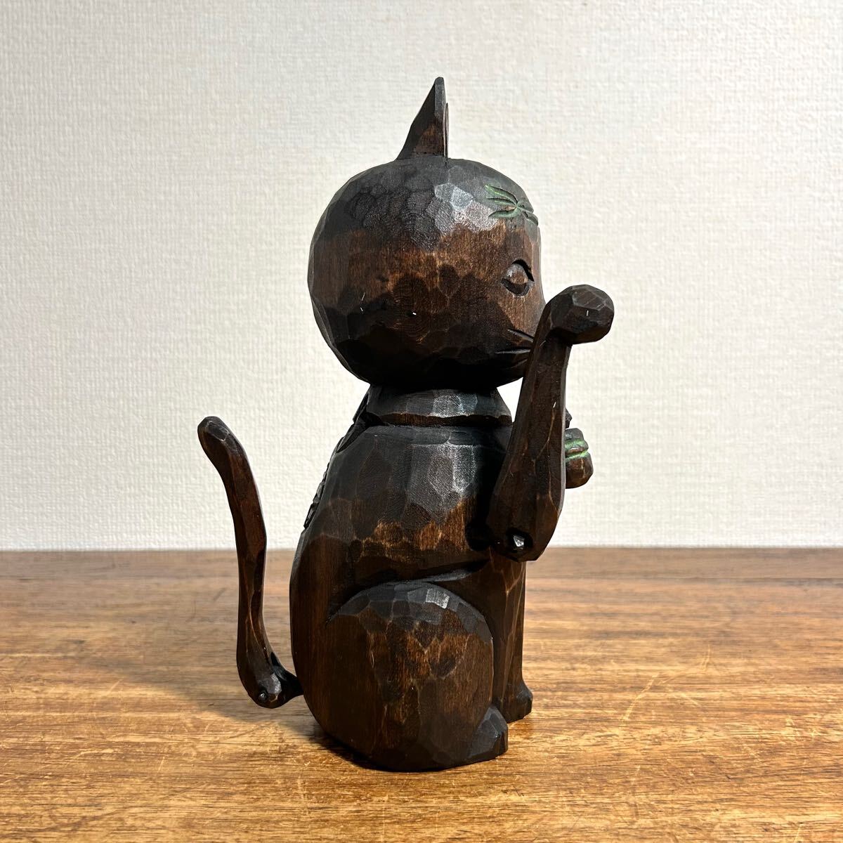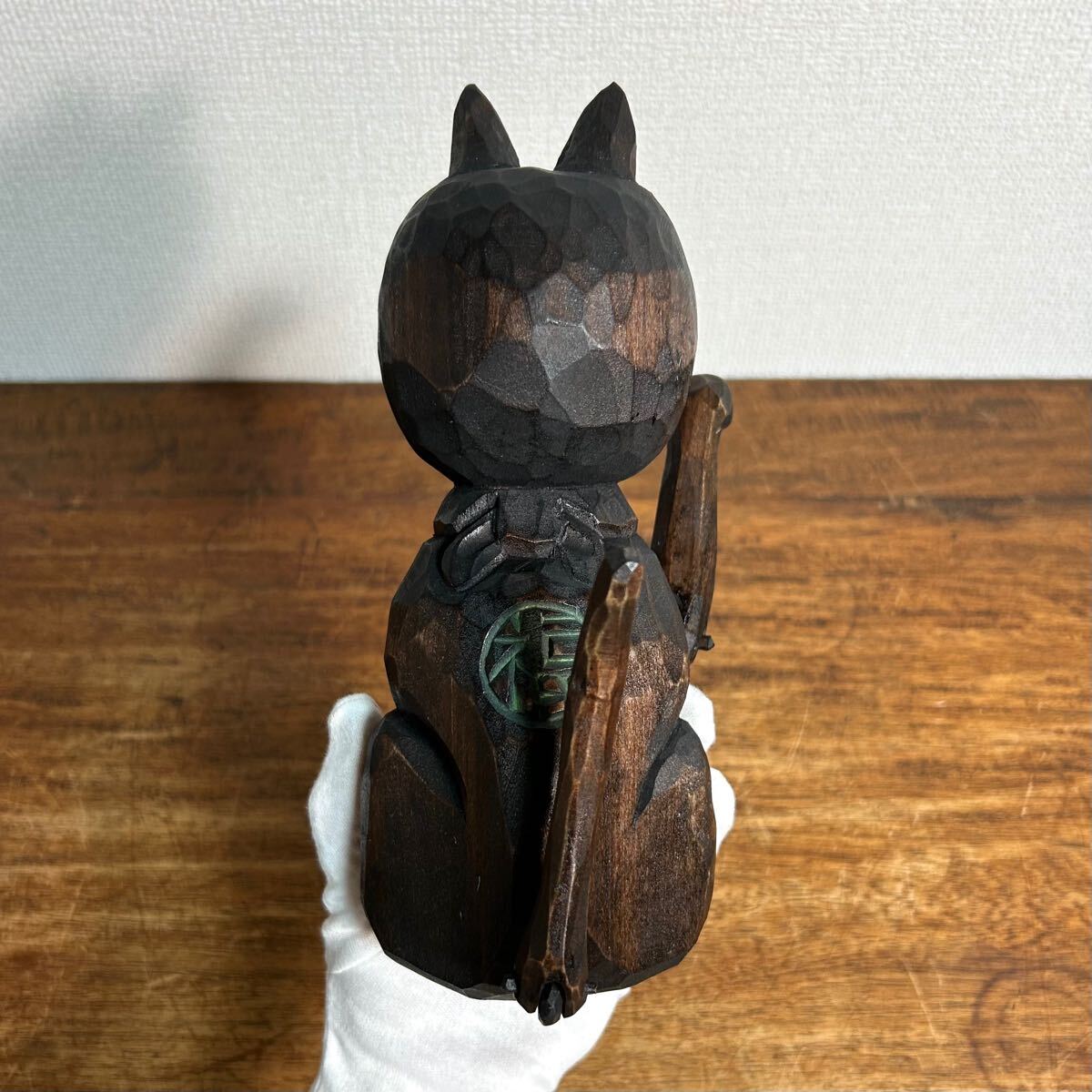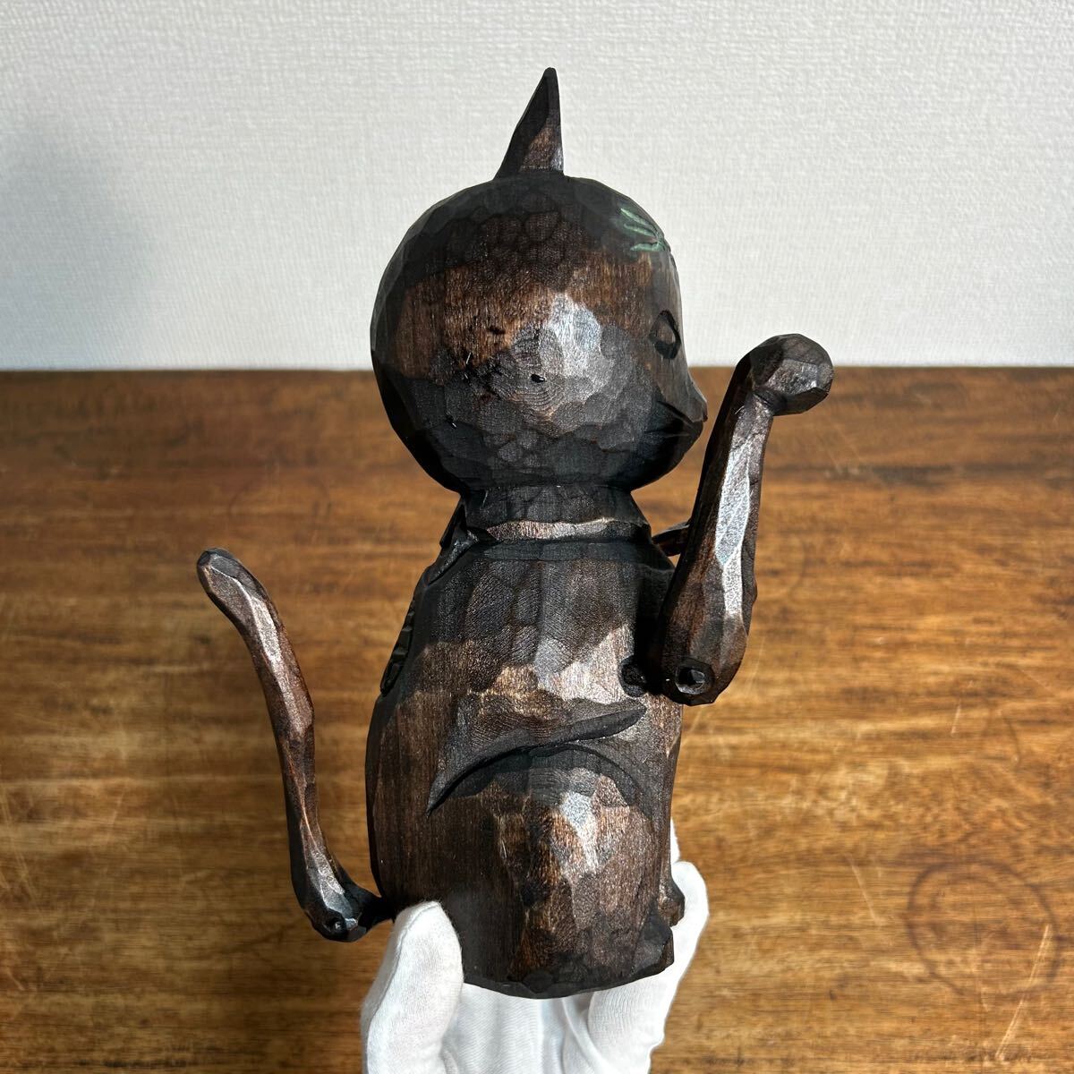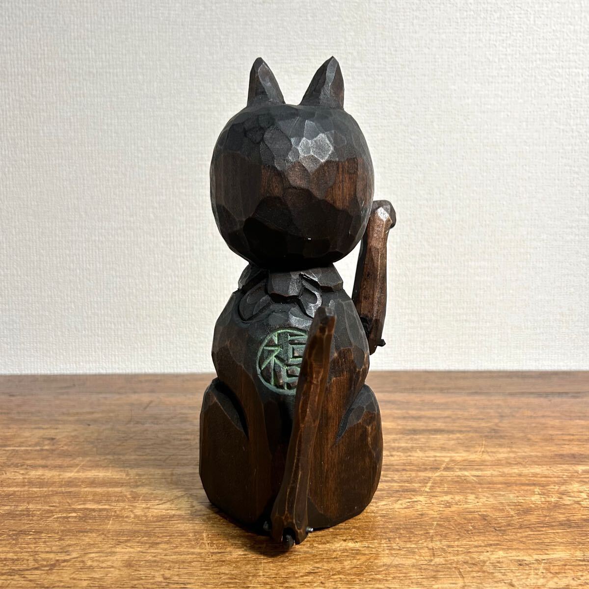 阿部紀男 木彫 招き猫 高さ23.6cm 「紀」 KIDAN アイヌ紋様 北海道 美唄 民芸品 美術工芸品 置物 彫刻 アート ネコ