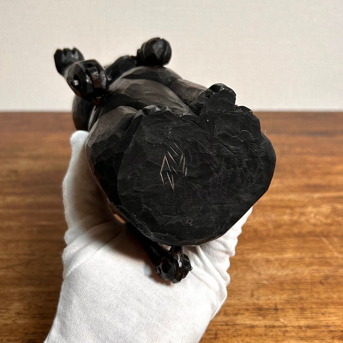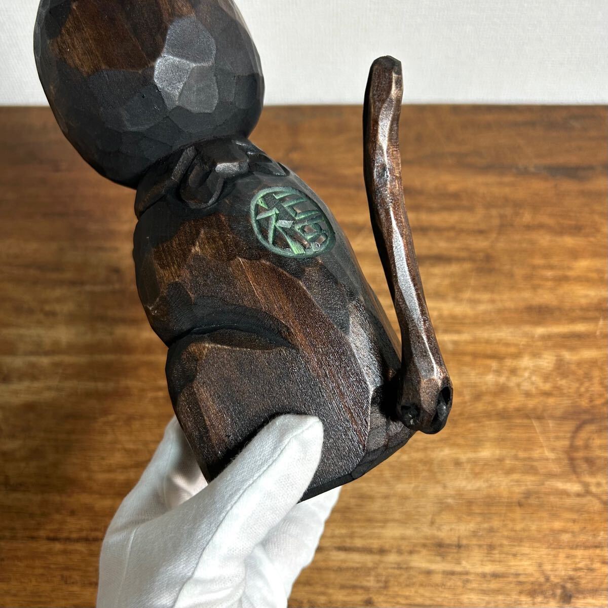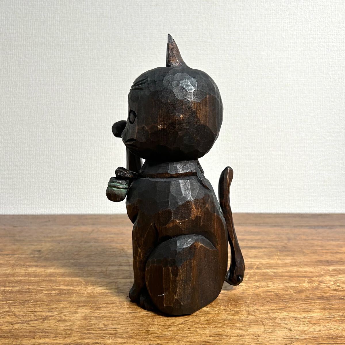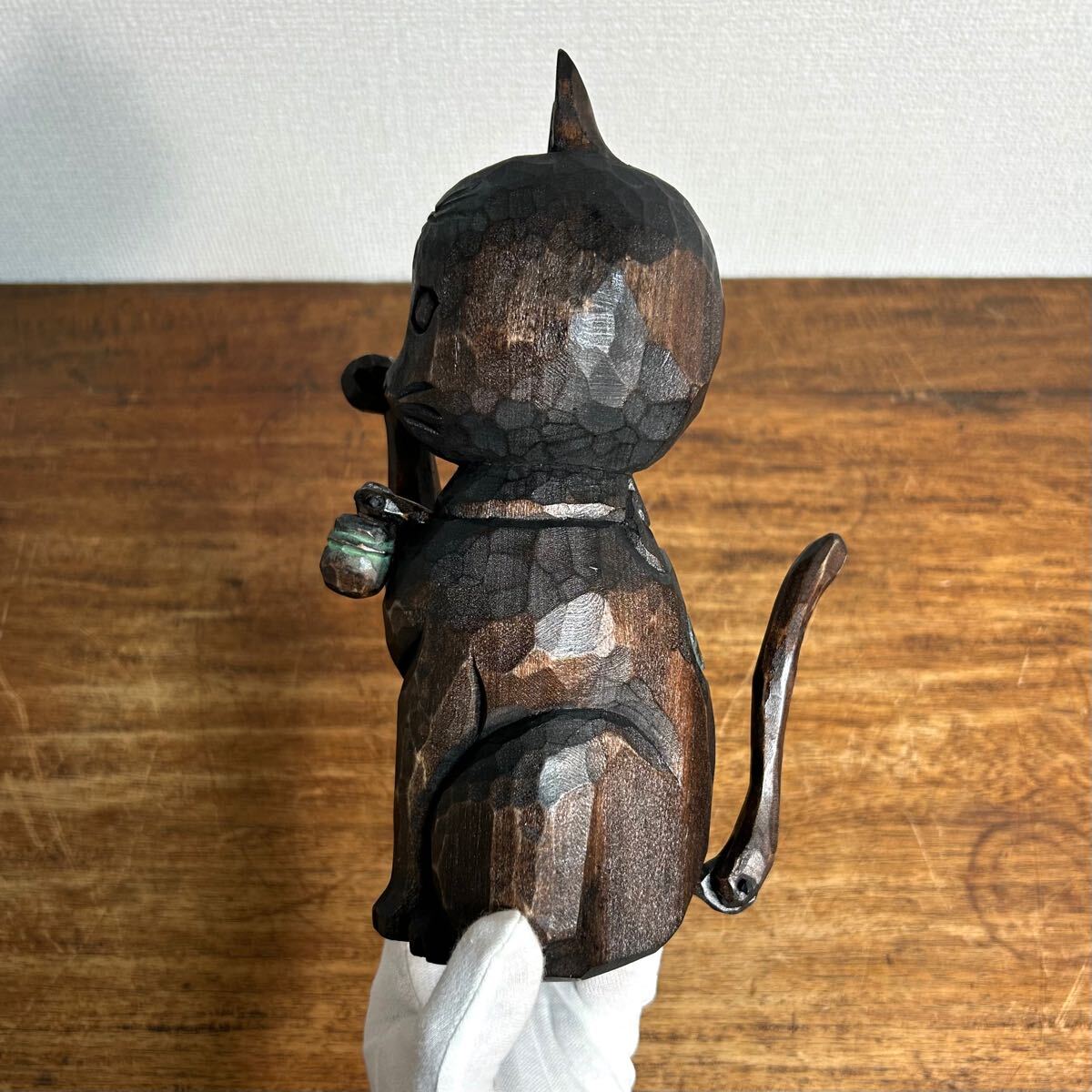 阿部紀男 木彫 招き猫 高さ23.6cm 「紀」 KIDAN アイヌ紋様 北海道 美唄 民芸品 美術工芸品 置物 彫刻 アート ネコ
