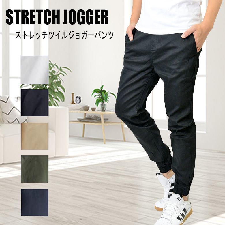 楽にはけるウェストゴムのストレッチツイル ジョガーパンツ。