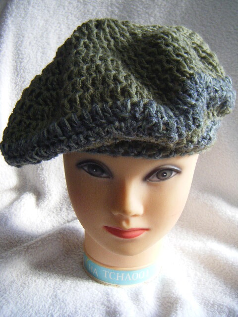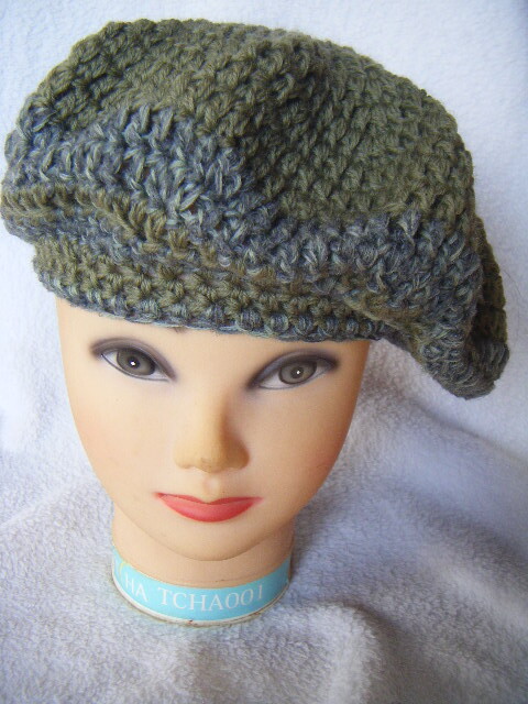 秋、冬*ベレー帽風*手編み男女兼用*くすんだ鶯色メインに、アクセントライン    ぬ