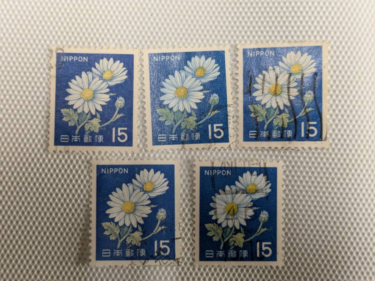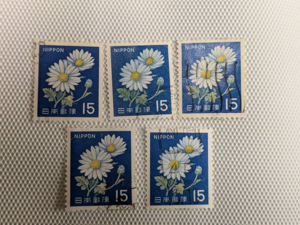 普通切手 1966-1989 新動植物国宝図案切手 Ⅱ.1967年シリーズ (封書15円時期・色検知導入後) キク 15円切手 単片 使用済 5枚