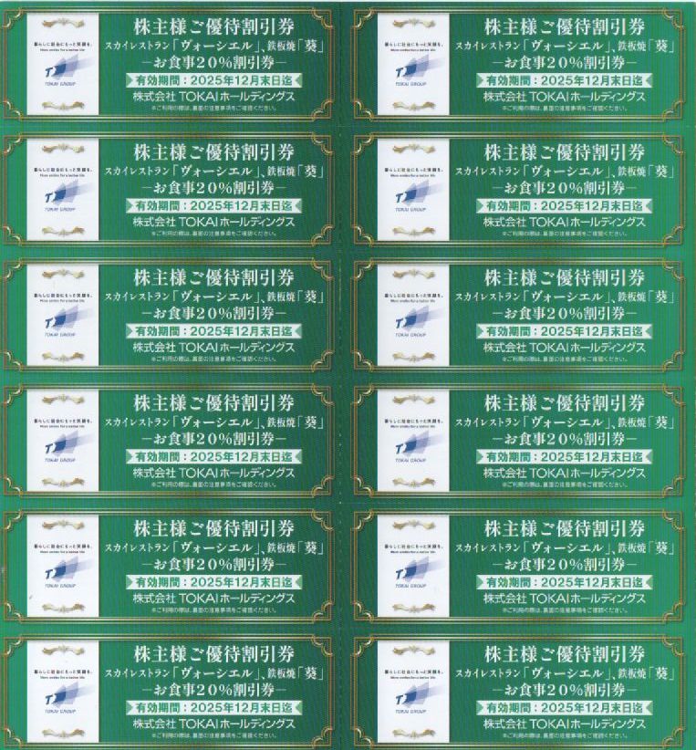 TOKAI 株主優待券 スカイレストラン「ヴォーシエル」、鉄板焼「葵」20%割引券 12枚 有効期限:2025年12月31日 普通郵便・ミニレター対応可