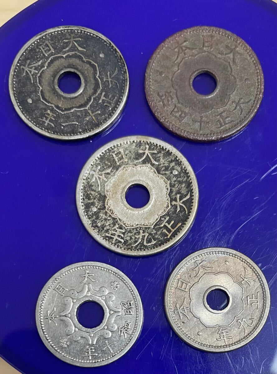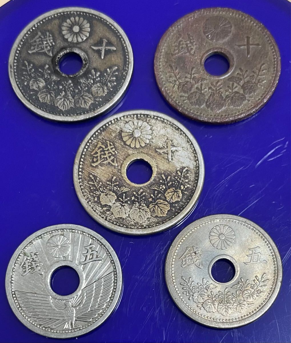 10銭白銅貨3枚、小型5銭白銅貨1枚、5銭ニッケル貨1枚の計5枚です。