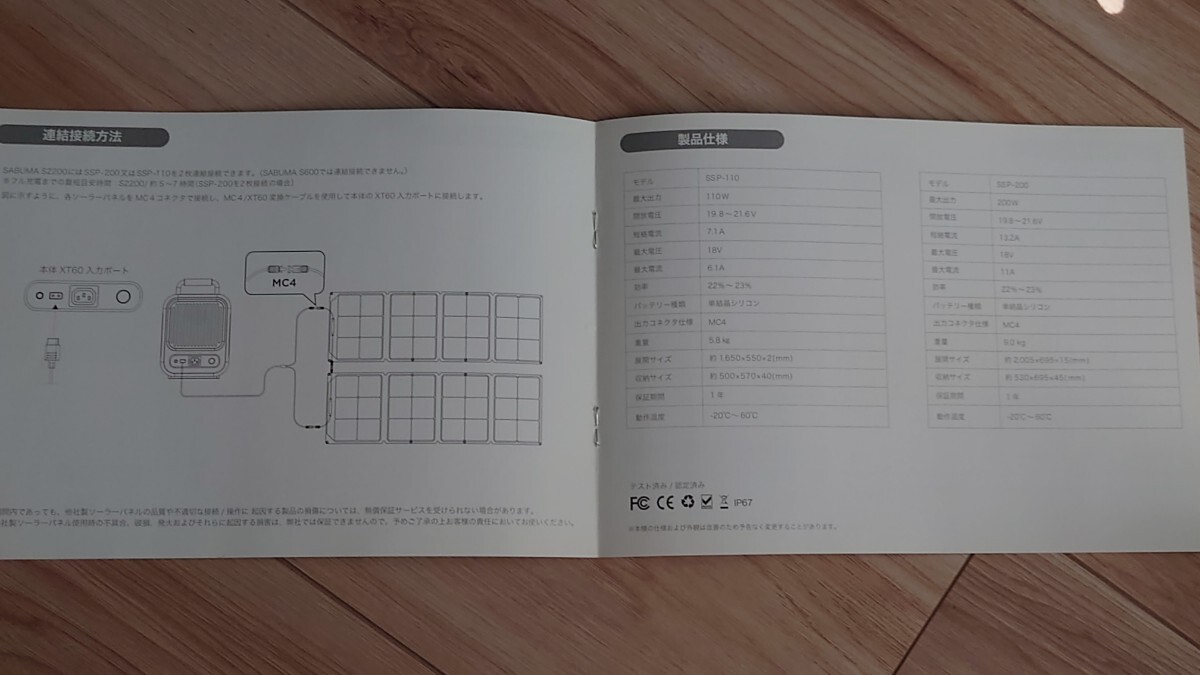 【レジャーや停電時にSABUMAポータブル電源を充電可能】SABUMA ソーラーパネル SSP-110は、業界最高クラスの高効率単結晶シリコン(変換効率22 - 23%)を搭載しており、キャンプや車中泊などのレジャー用途や停電時にSABUMAポータブル電源を充電することができます。【持ち運びに便利でいつでもどこでも充電可能】パネル本体に取手と充電ケーブル収納用スペースが備わっており、折り畳んでコンパクトにできるため、持ち運びに便利です。キャンプなどのレジャー用途に加え、災害等の停電時にオフグリッドでポータブル電源を充電できます。 また、ソーラーパネル本体はキックスタンド付きで単体で自立可能なため、最適な角度で太陽光に向けて設置することが可能です。【耐久性の高い防水・防塵機能】ソーラーパネル本体は、IP67という非常に高い防水防塵機能を備えており、耐久性に優れているので屋外でも安心してお使いいただけます。【効率よく充電】SABUMA ポータブル電源に内蔵されたMPPT(最大電力追従制御)アルゴリズムが、寒さや曇りといった起床条件下でのSSP-110の性能を改善するように常にコントロールしてくれます。【製品仕様】展開サイズ:1,650 x 550 x 2 (mm) / 折畳サイズ:500 x 570 x 40 (mm) 、重量:5.8kg、最大出力:110W、開放電圧:19.8 - 21.6V、短絡電流:7.1A、最大電圧:18V、最大電流:6.1A、効率:22 - 23%、バッテリー種類:単結晶シリコン、出力コネクター:MC4、防水規格:IP67【付属品】①製品本体 SABUMA SSP-110、②ユーザーズガイド/