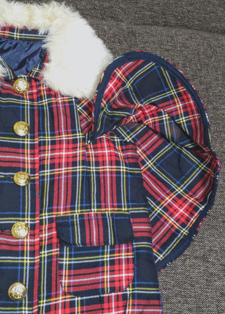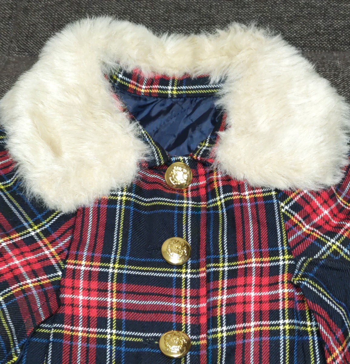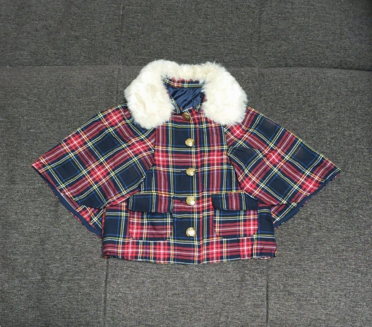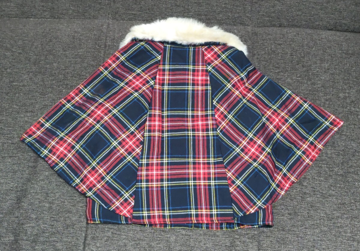 新品同様☆ ポンチョ風の上着 羽織り 赤チェック柄 ベージュのファー付き襟 金のボタン5個
