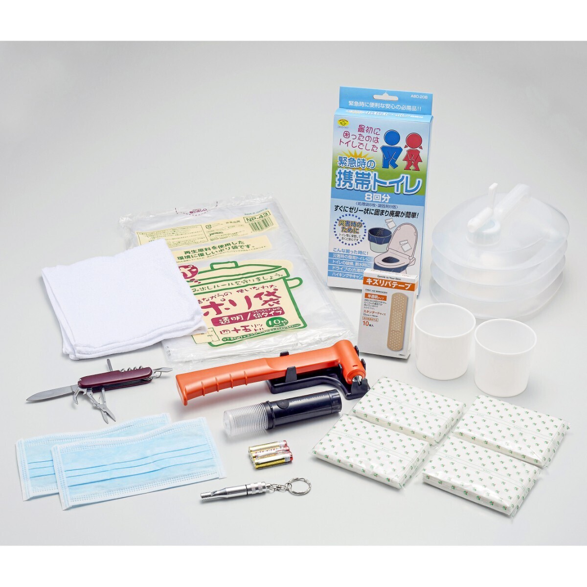 セット内容マグネット付LED信号灯、車脱出用ハンマー、携帯トイレ8回分、3リットルポリバケツ、アルミ製ホイッスル、救急絆創膏、タオル、不織布マスク×2、ゴミ袋、コップ×2、万能ナイフ、ポケットティッシュ×4、点灯確認用電池(単4形)×3