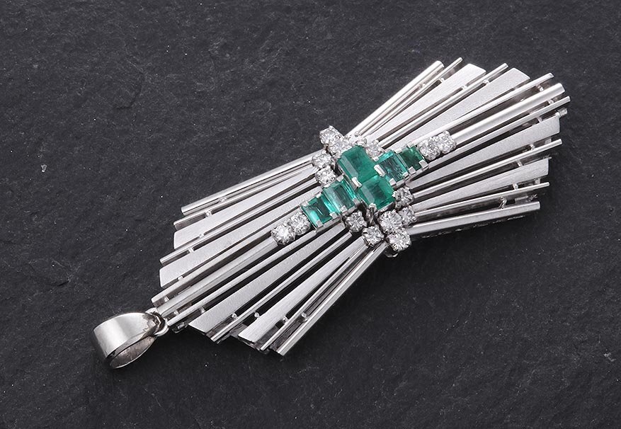 | コメント | [[全ての商品に品質保証カードが付きますのでご安心ください]]デザインの美しさに目を奪われます。美色のエメラルド、輝くダイアモンド、プラチナの硬質な輝き、見飽きない素晴らしいペンダントです。エメラルド、ダイアいずれの刻印もありませんが本物確認がとれています。 |