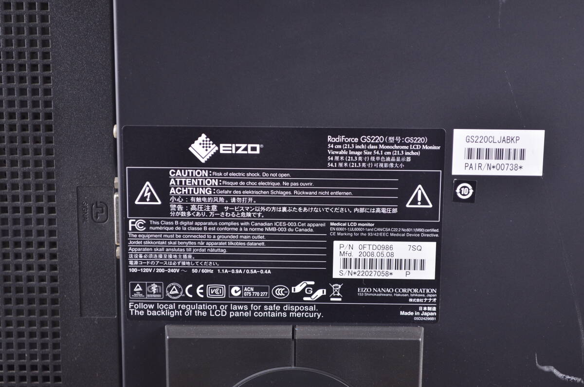 5423 医療用モニター EIZO RadiForce GS220 21.3型ワイド 解像度1200x1600 モノクロ IPSパネル ディスプレイ