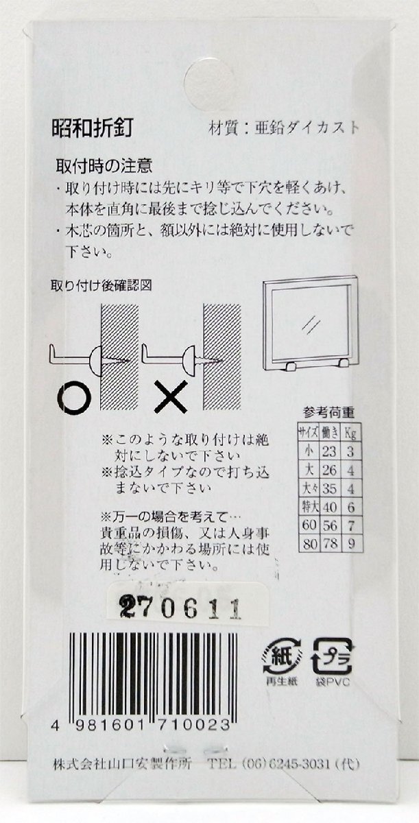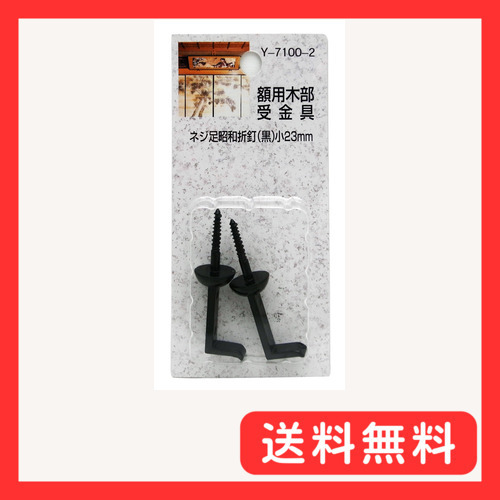 「山口安製作所額用木部受金具ネジ足昭和折釘(黒)小23mmY-7100-2」▼4981601710023▼(商品説明)・ 23mm Y-7100-2・・Size:23mm・材質:亜鉛ダイカスト・参考荷重:3kg説明 取付時の注意 ・取り付け時には先にキリ等で下穴を軽くあけ、 本体を直角に最後まで捻じ込んでください。 ・木芯の箇所と、額以外には絶対に使用しないで下さい。 ※万一の場合を考えて・・・ 貴重品の損傷、又は人身事故等にかかわる 場所には使用しないで下さい。