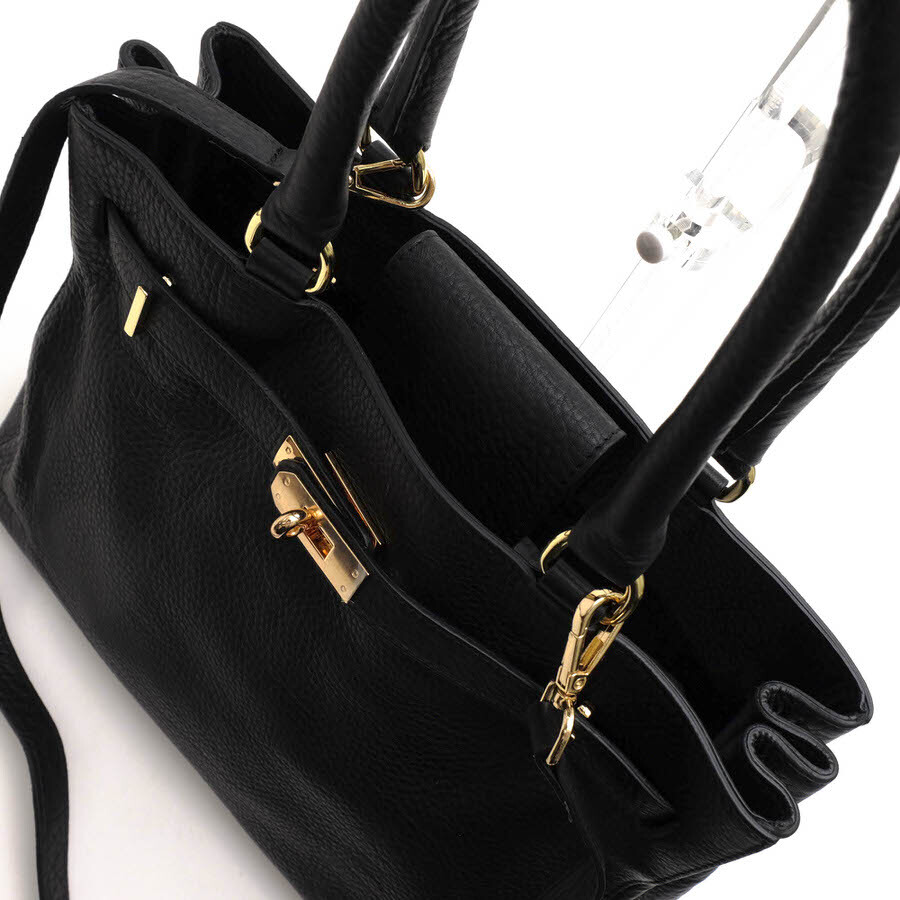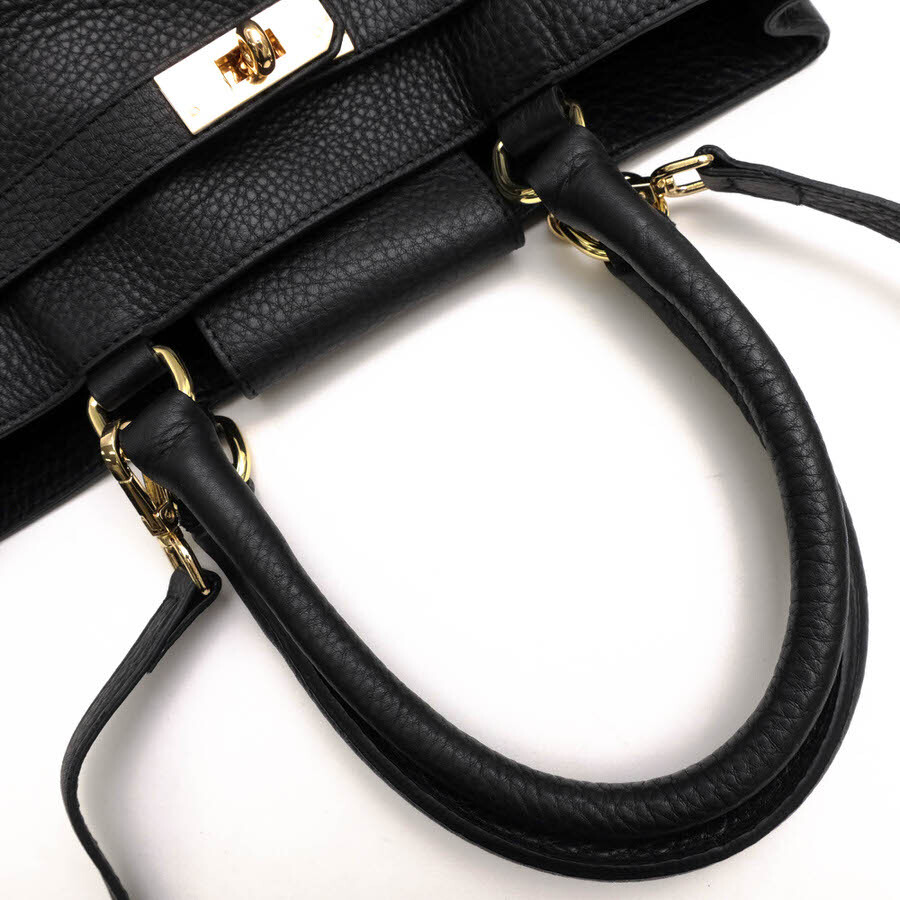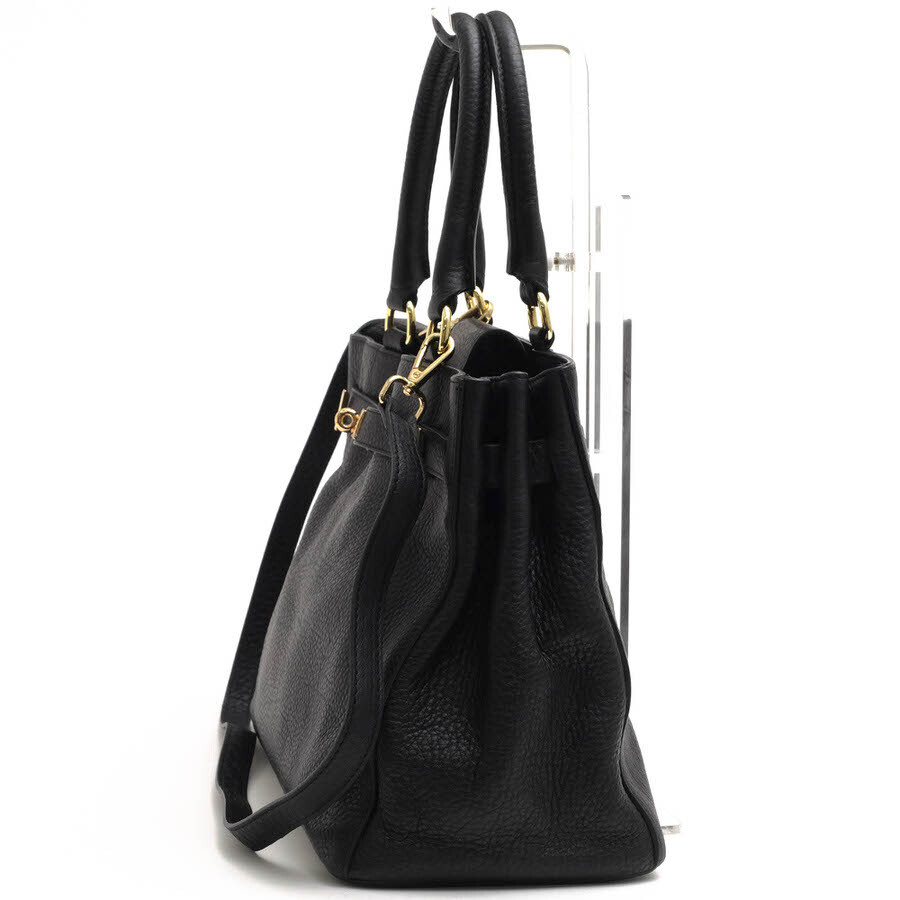 美しいシボ感が特徴で、リュクスな印象を与えるベルト装飾がポイントになった上質な牛革製バッグ。内側にはファスナーポケットとオープンポケットがあり、スマートフォンやキーケースなどの収納に便利です。ゴールドの金具とシボ感のあるレザーがカジュアルさをプラスし、オンオフ問わずコーディネートしやすいデザインです。お仕事やおでかけにぴったりのアイテムです。 |