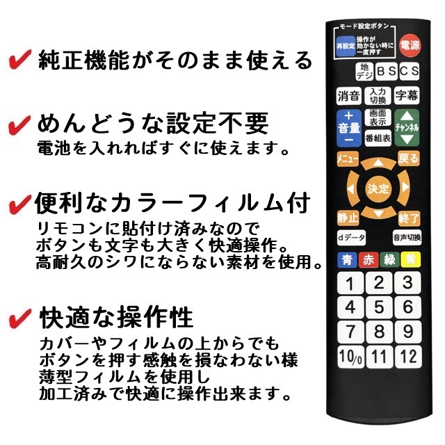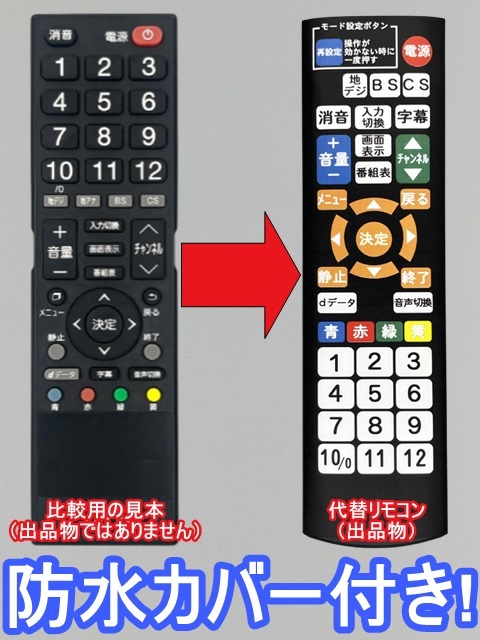 | 【商品名】 TECO W3W 代替リモコン 【対応機種】 TA4231JS TA3231JW TA3231JWA 等用 画像1枚目左側のリモコンが付属する機種に使用出来ます。 上記機種以外については、質問欄よりメーカーと型番をご連絡頂ければ、対応品のご案内をしております。 【商品について】 右側の代替リモコンが出品物になります。左側のリモコンは見本画像です。 タイトル機種のリモコン信号を入力した、設定不要で使える純正品と同等の代替リモコンです。 アナログボタンは現在使用出来ませんので割り当てをしていません。 商品に不具合があった場合は代替品交換かご返金にて対応させて頂きます。 【付属品について】 防水リモコンカバーをお付けします。 ボタン機能を印刷した薄型フィルムはリモコンに貼付け済みです。 乾電池は付属しません。別途ご用意下さい。(単4乾電池×2本) 【発送について】送料無料 迅速発送を心掛けております。土日祝日はお時間を頂く場合ございます。 ポスト投函配達となり、日時指定は出来ません。 | ||