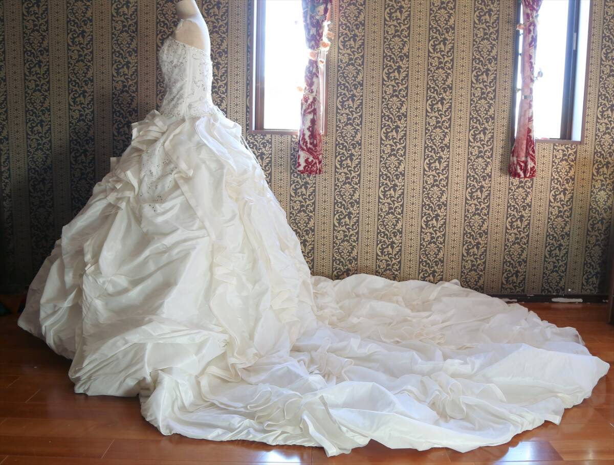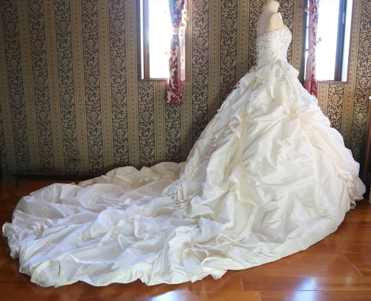 実寸はバスト8295cm、ウエスト6476cm、前中心から裾までの丈約139cm、脇下から裾までの丈約140cm、後ろ丈約265cm、多少の誤差はご了承ください。