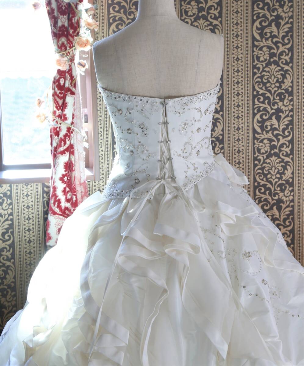ドレスはバストとウエストのサイズで着用しますので、「○サイズの服が着れるから』『身長が低いから』等で判断せず、必ずご自身のサイズを計って入札をお願いいたします。