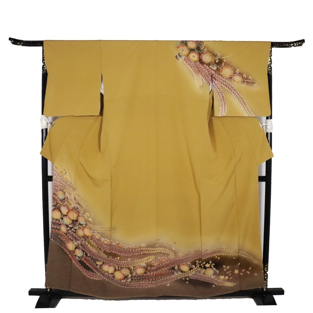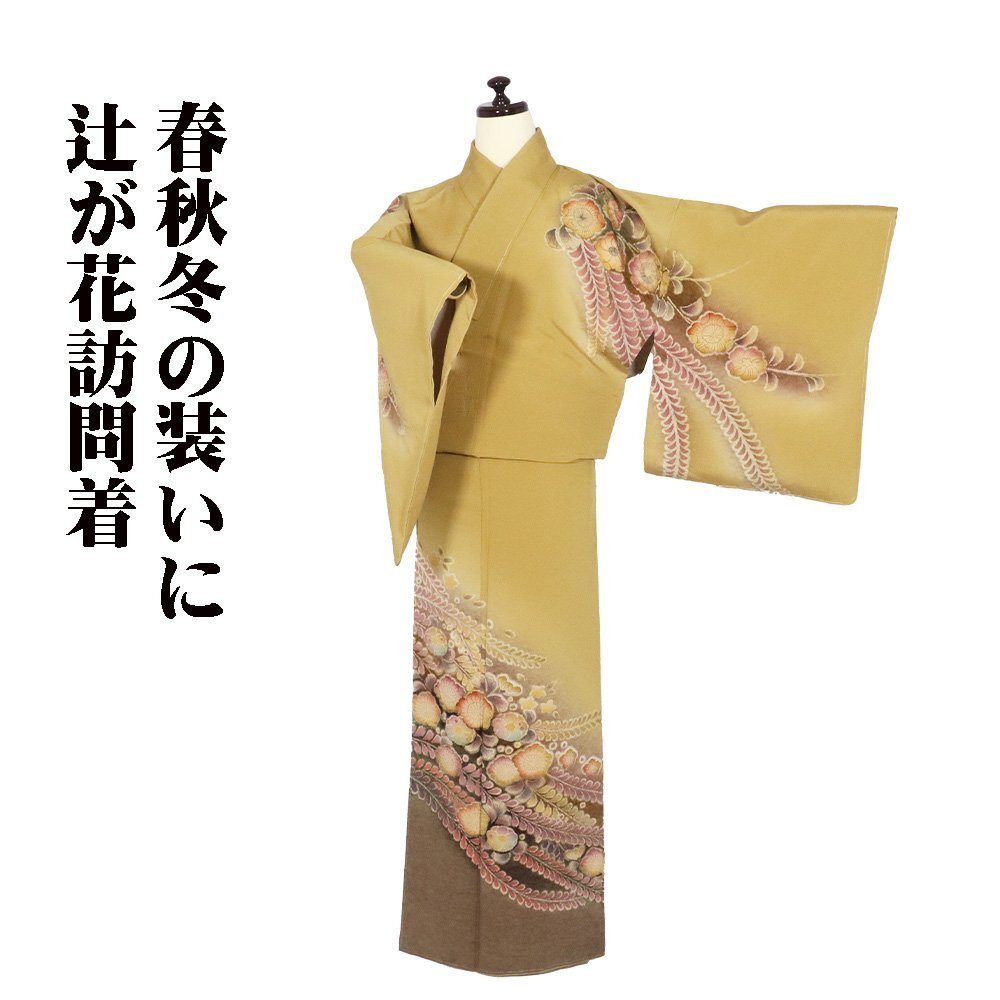 | 辻が花訪問着 袷 丹後縮緬地 黄土色(山吹茶色)・紫(紫色)暈し地 絞り・辻が花 166 広襟 新品 仕付け付き |