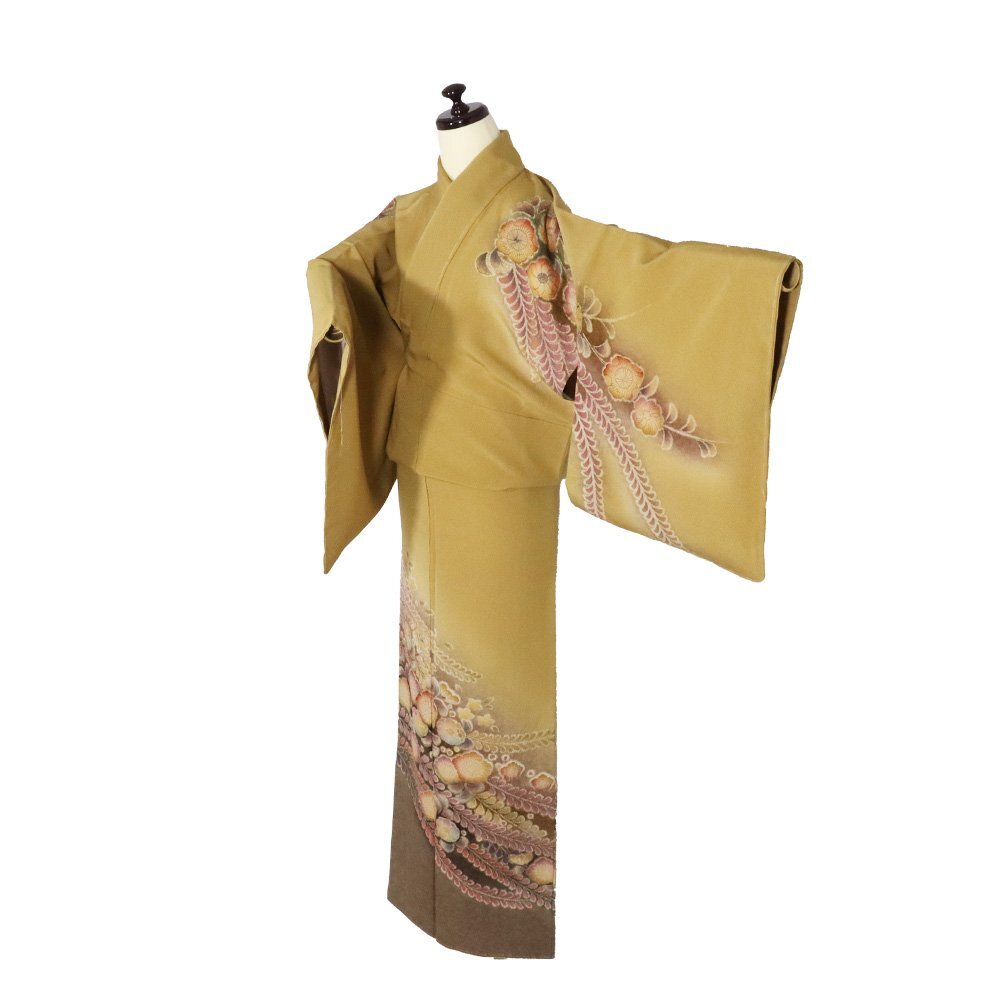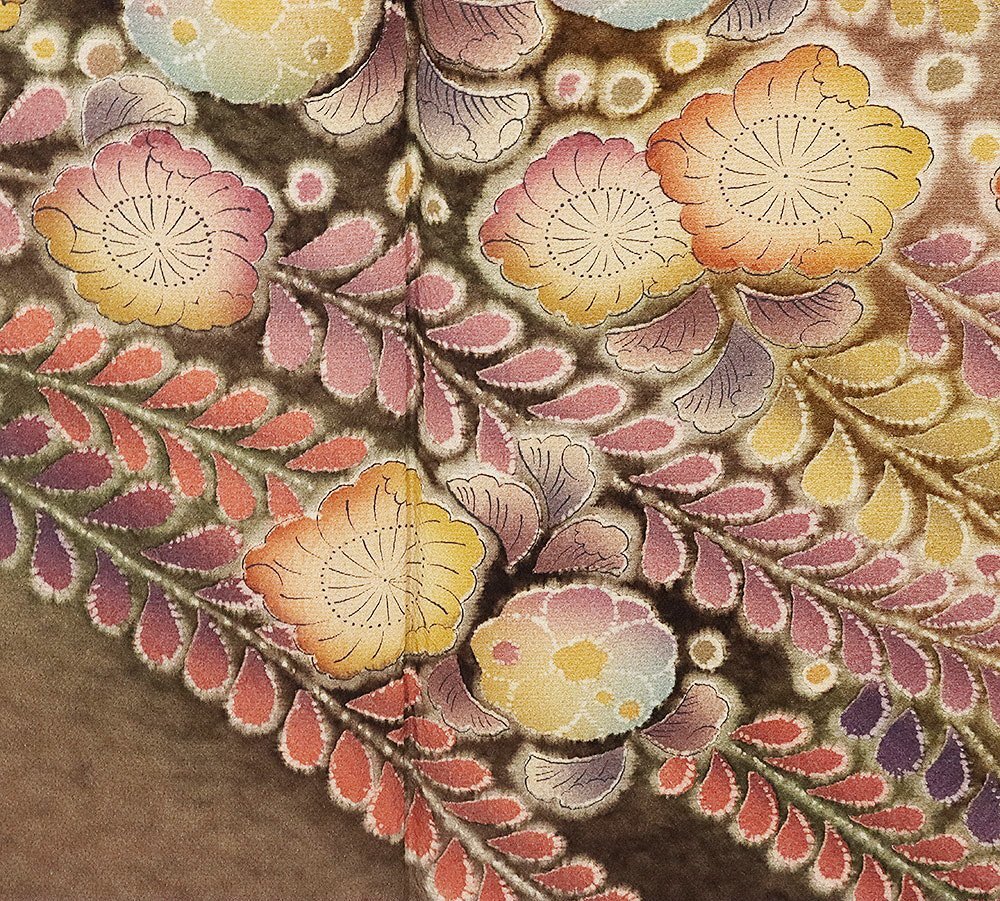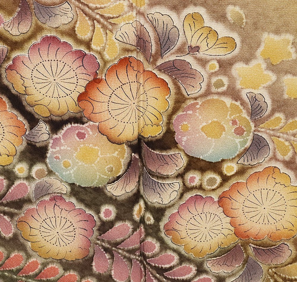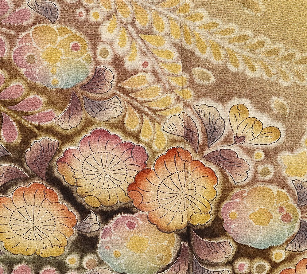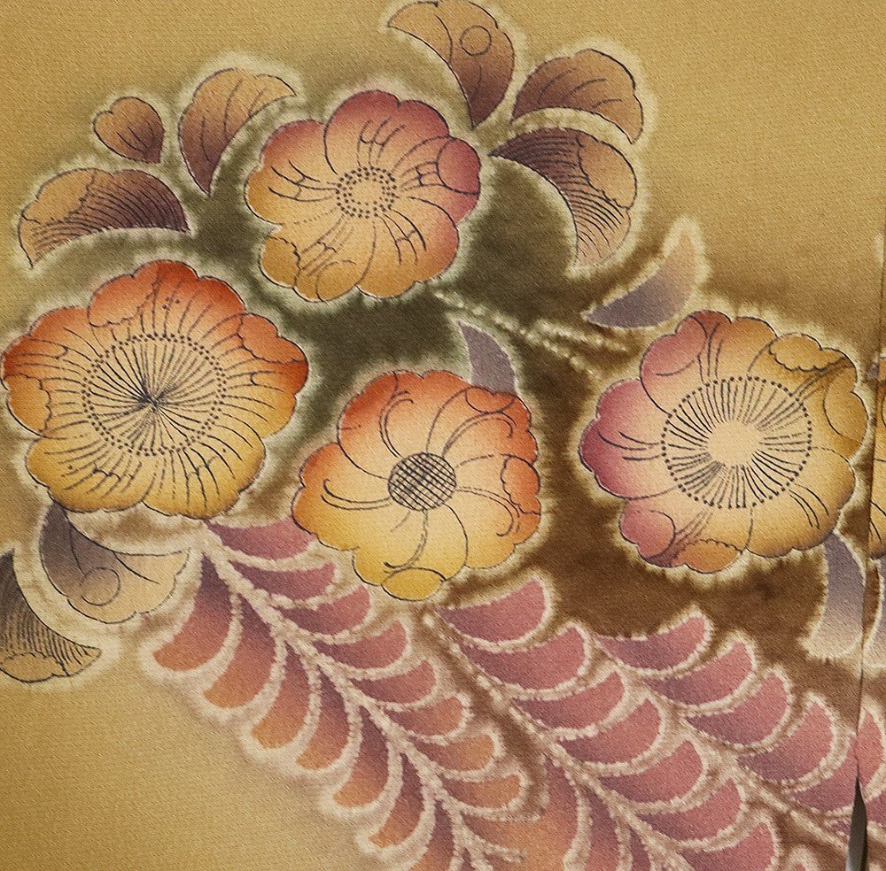 辻が花訪問着 袷 丹後縮緬地 黄土色(山吹茶色)・紫(紫色)暈し地 絞り・辻が花 (写真では上手く色が出ない場合があります。ご了承下さい) |