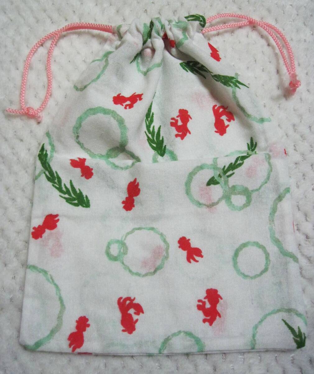 雑貨■ママ工房 巾着袋No.005B 金魚柄 かわいい ホワイト ピンクひも 収納 B5サイズ 夏 クール 涼しい ハンドメイド おしゃれ ファッション