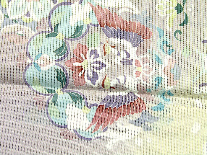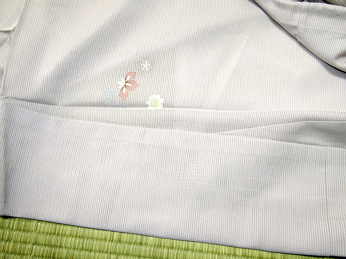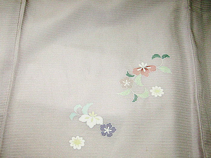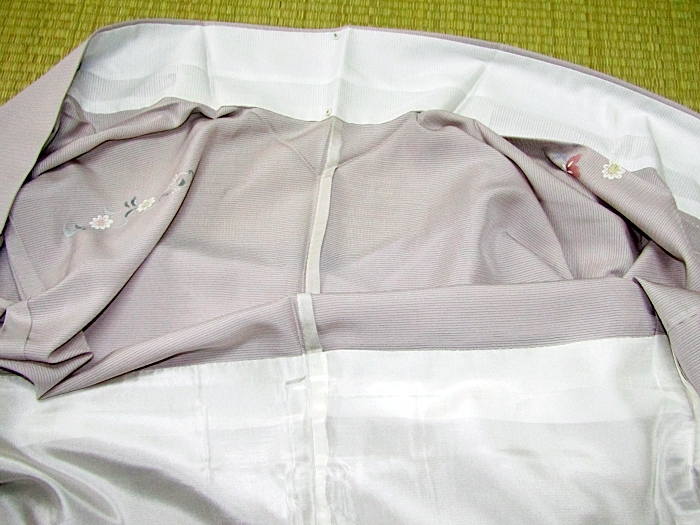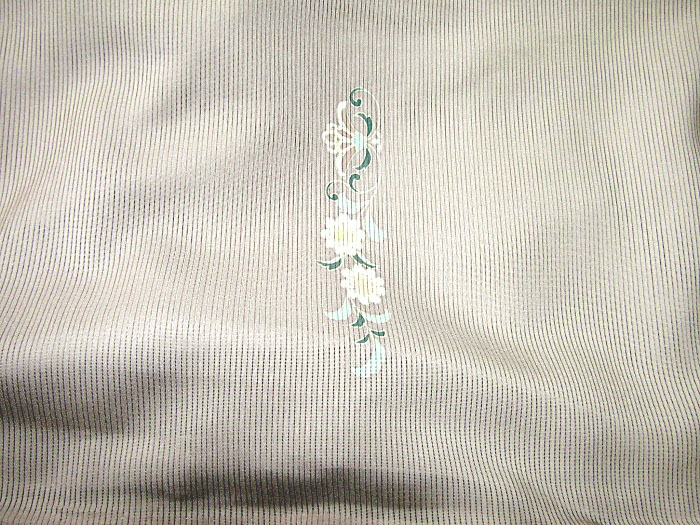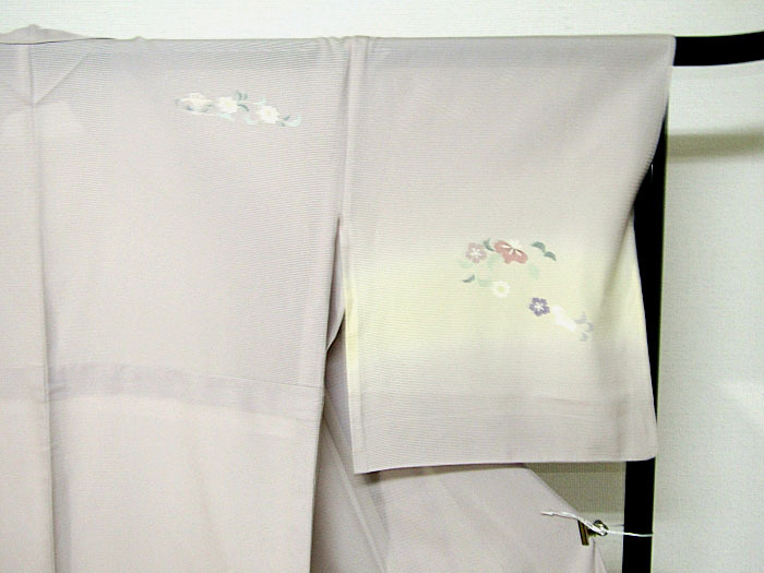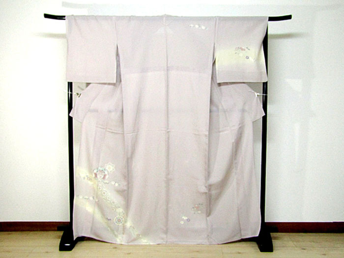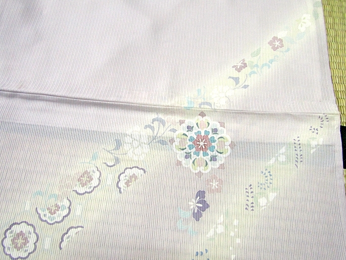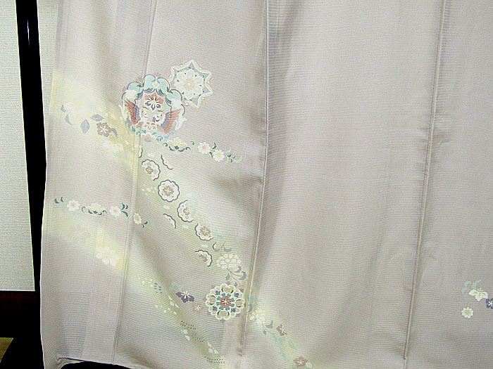 薄い藤色地、双鳥唐花文文様の絽附下きものです。