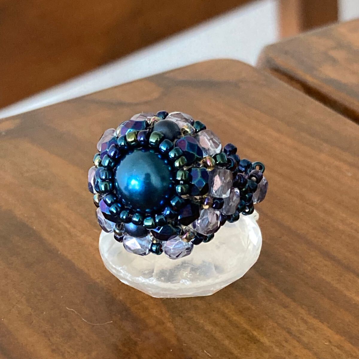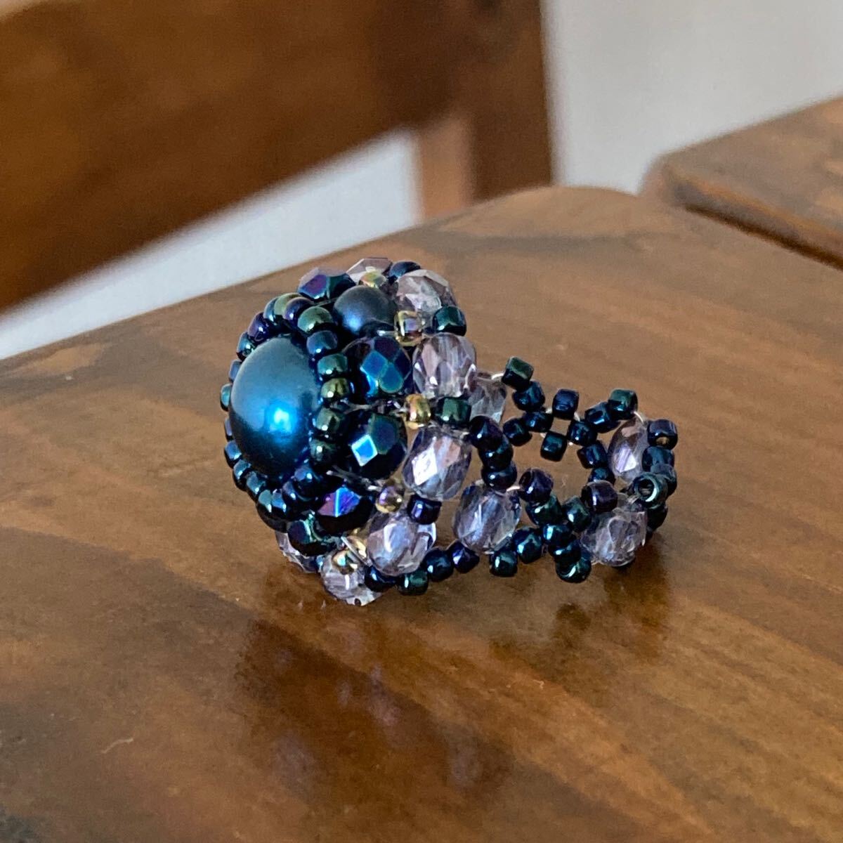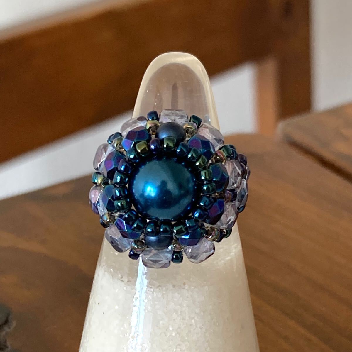 6mmのブルーグリーン系のパールビーズ、4mmのブルー系玉虫色、クリアブルーのチェコビーズ、メタリックブルー系の丸小ビーズで作ったリングです。