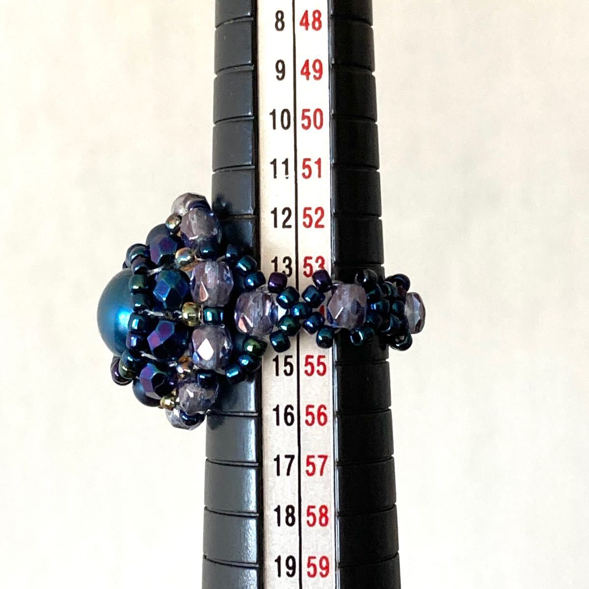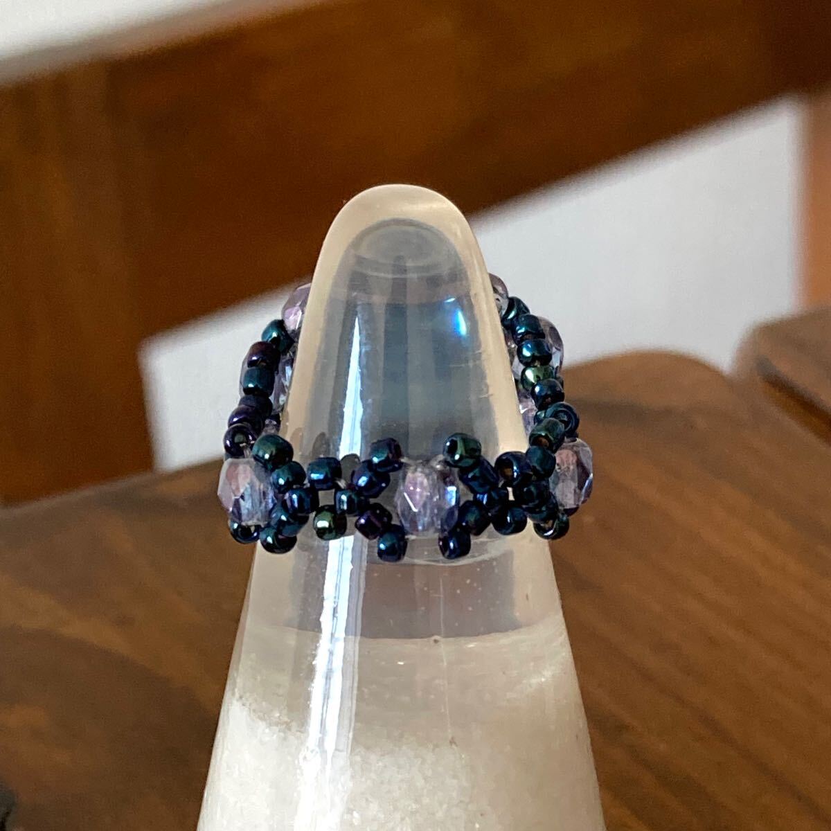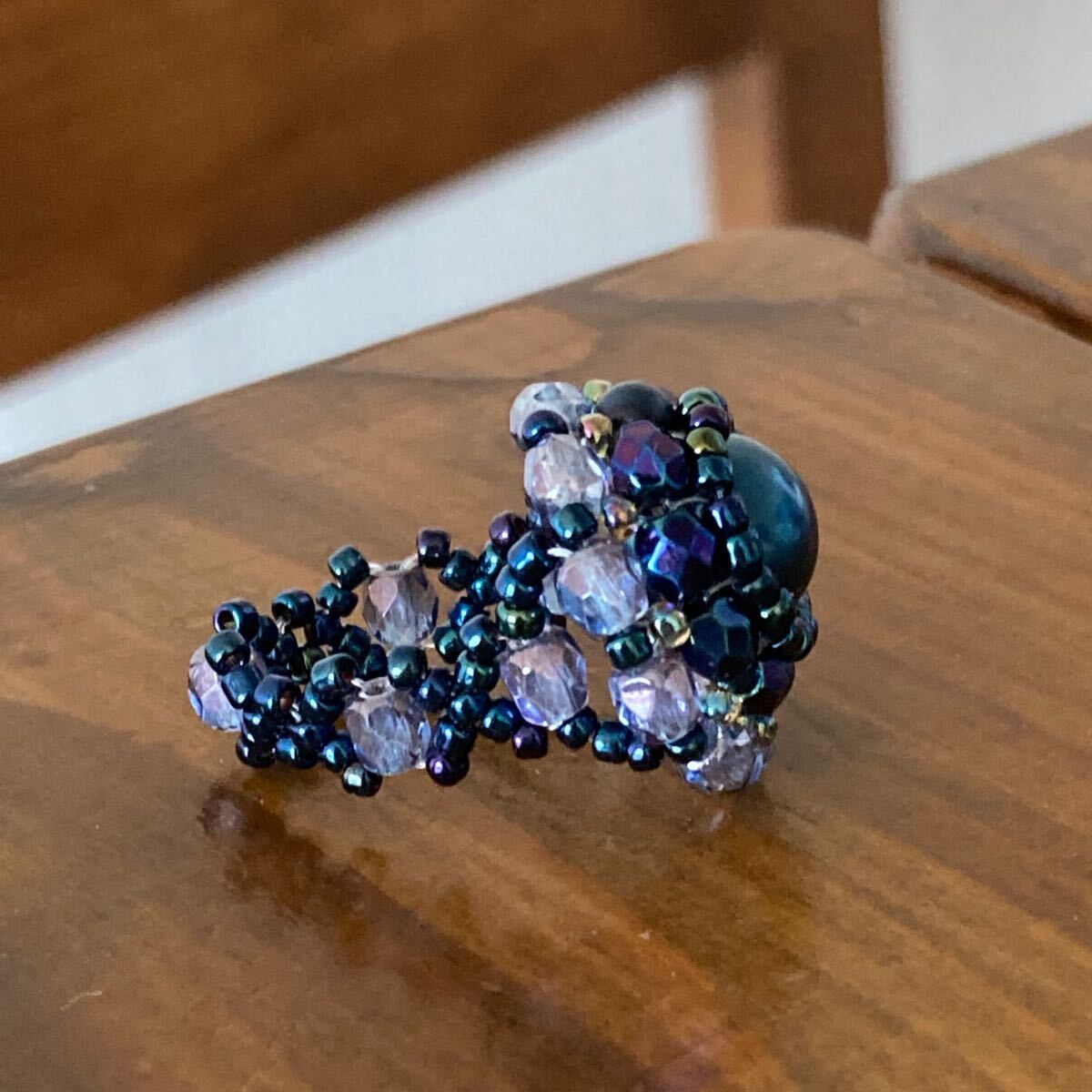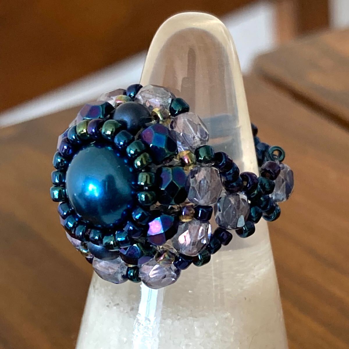 6mmのブルーグリーン系のパールビーズ、4mmのブルー系玉虫色、クリアブルーのチェコビーズ、メタリックブルー系の丸小ビーズで作ったリングです。
