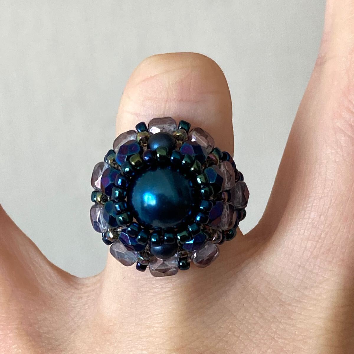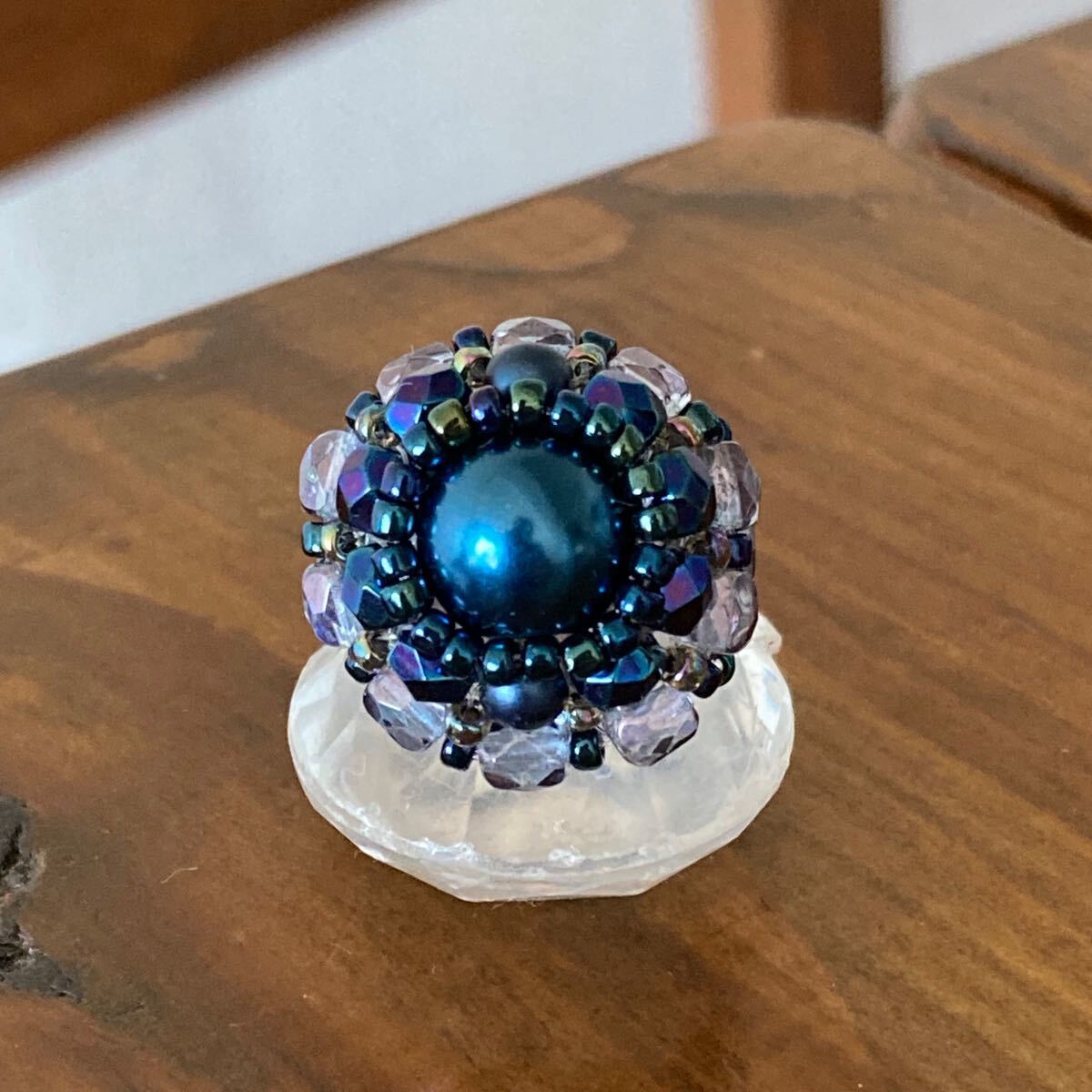 綺麗なブルーグリーン系のパールビーズの周りを3重に細かく編んだお花風デザインのリングです♪