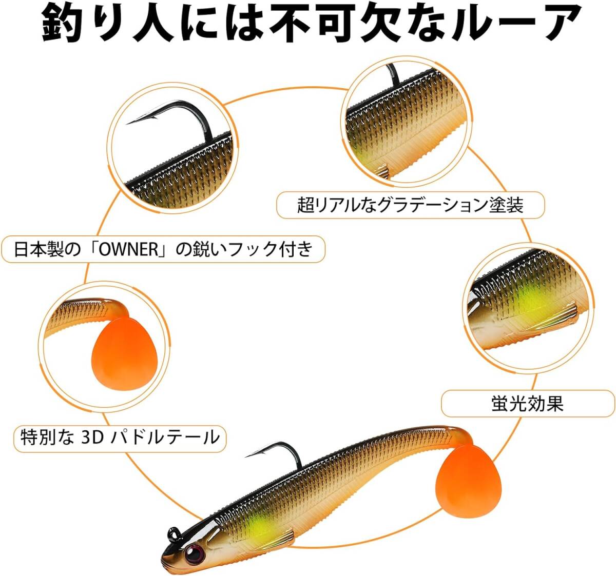 例えば、「T」字型のパドルテールがリアルな動きを作り出し、魚を引き寄せます。