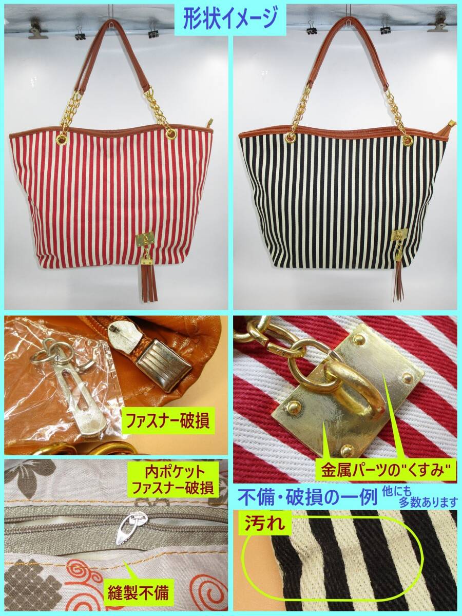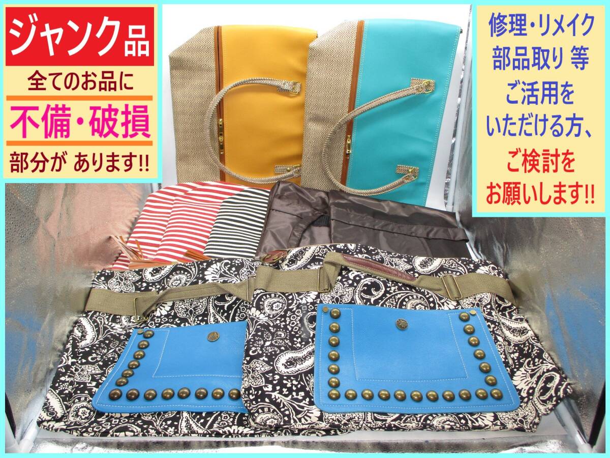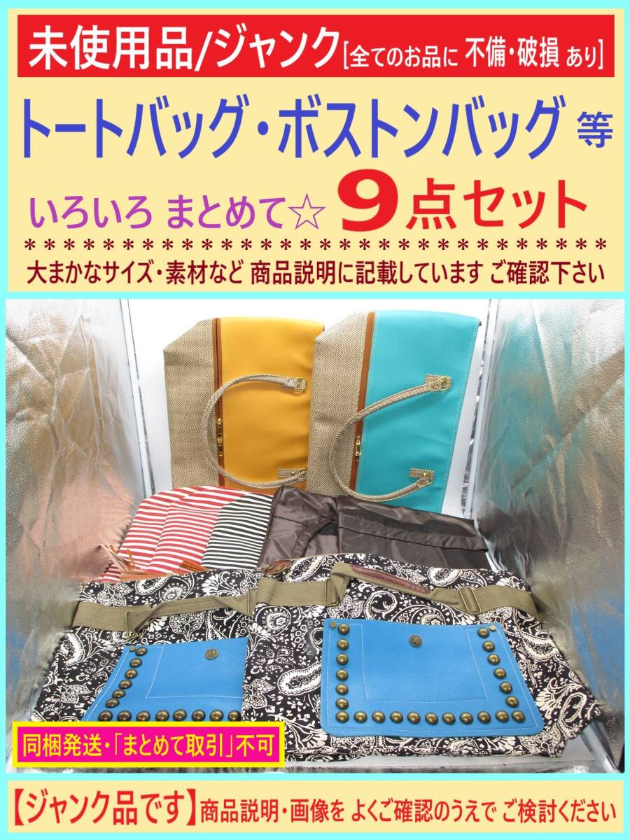 | 【ご注意】 こちらの商品は、「ジャンク」扱いでの出品です。 部品落ち、ファスナー等の動作不良、経年による破損等が確認でき、 このままお使いになるには不都合があるお品です。 補修できる方・部品取りをご希望の方・小道具に入用の方などに ご利用いただければと思い、安価にて出品いたします。 商品説明・画像等をよくご確認いただき、ご検討下さい。 ******************************** 撮影・確認の為、ファスナー開閉などをしましたが、未使用品です。 専用のパッケージ等の外装は、ありません。 倉庫での長期保存品です。 以下の商品説明をよくご覧になってから、ご検討をお願い致します。 神経質な方、完品をご希望の方は、御入札をご遠慮ください。 【商品内容】 ジャンク品/トートバッグ・ボストンバッグ 等 まとめて 9点 《大まかな仕様》 ☆画像3・4/トートバッグ(ブルー・イエロー 各1点) サイズ: 約 44×30×13(cm)*持ち手含まず 材質:主に合皮 備考:ショルダーベルト付属 ☆画像5・6/ボストンバッグ(ブラウン 2点) サイズ: 約 47×29×19(cm)*持ち手含まず 材質:詳細は不明ですがナイロン系と思われます ☆画像7・8/ストライプ柄トートバッグ(レッド×2・ブラック×1) サイズ: 約 43×30×10(cm)*持ち手含まず 材質:主に布(キャンバス地) 他 合皮 金属など ☆画像9・10/メッセンジャーバッグ(ペイズリー柄・2点) サイズ: 約 48×36(cm)・マチなし*持ち手含まず 材質: 主に布製、合皮、金属他 備考:ショルダーベルト付属 《共通事項》 ・海外製/タグがないので メーカー等の詳細は不明 ・倉庫にての長期保存品 *状態・セット内容は画像にてご確認下さい *実際の商品の色味とは異なる場合があります *商品寸法は当方のメジャーによる実測値です 実際の使用に際しましては、多少の誤差がある場合があります 【状態等】 ・撮影・確認の為、ファスナー開閉などをしましたが、未使用品です。 ・専用のパッケージ等の外装は、ありません。 ・海外製につき、作りや縫製・仕上げの粗さがある場合があります。 また、長期保存品の為、ホコリの付着等がある場合があります。 ご了承ください。 ・全てのお品において、 汚れや生地の傷み、ファスナー等パーツ不備・破損、合皮部分劣化、 縫製不良、パーツキズ、経年による変色劣化 …等の不備が見られます。 全てを画像に掲載する事は出来ませんが、あらかじめご了承下さい。 以上の点より「ジャンク」扱い品として、 安価にて出品いたします。 ご承知をいただける方のみ、ノークレーム・ノーリターンにて ご検討下さい。 【補足】 「ジャンク」という表現は、 「本来の利用価値が損なわれた物」「正常な動作を保証しない物」 「保証対象外の物」を意味する言葉として使用しています 【発送について】 ・おてがる配送《日本郵便・ゆうパック》(追跡・補償あり/対面・置き配等) [配送料は お届け地域により異なります] にて、発送いたします。 ・梱包済み商品の為、 他の商品との同梱による発送(「まとめて取引」含む)は お断りさせていただきます。 *当商品を含む「まとめて取引」依頼に関しましては、 予告なく、「単品取引」へと移行させていただきます。 *画面上に「まとめて取引をはじめる」と表示される場合がありますが、 その項目の下にある「単品で取引する」をお選びいただき、 お取引を開始していただくようお願い致します。 ・梱包サイズ:約 48cm×37cm×25cm/重量:約 5kg ・配送先のポスト・宅配ボックス等に入らない場合は、 不在通知などの対応がされる可能性がございますので、 落札者様の方でその後の対応をお願い致します。 ・梱包には、再利用資材を使用することがあります。 ご了承ください。 状態・付属品につきましては、画像をご覧ください。 | |||