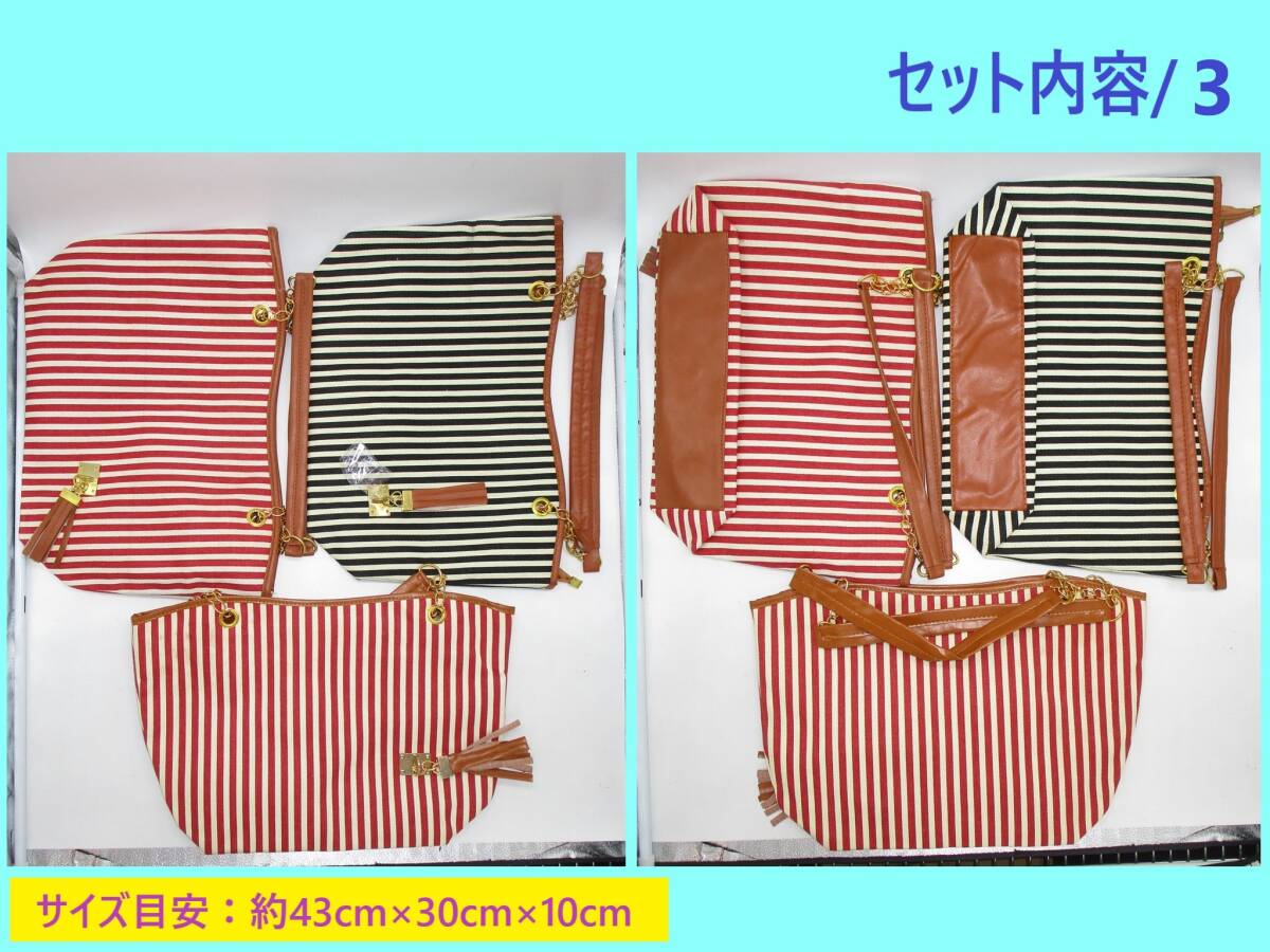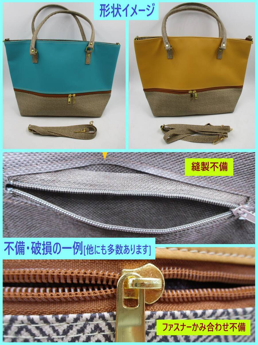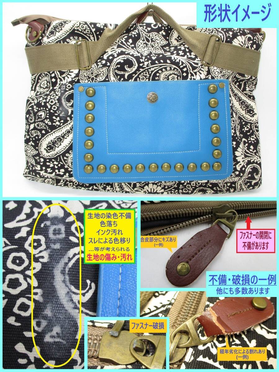 | 【ご注意】 こちらの商品は、「ジャンク」扱いでの出品です。 部品落ち、ファスナー等の動作不良、経年による破損等が確認でき、 このままお使いになるには不都合があるお品です。 補修できる方・部品取りをご希望の方・小道具に入用の方などに ご利用いただければと思い、安価にて出品いたします。 商品説明・画像等をよくご確認いただき、ご検討下さい。 ******************************** 撮影・確認の為、ファスナー開閉などをしましたが、未使用品です。 専用のパッケージ等の外装は、ありません。 倉庫での長期保存品です。 以下の商品説明をよくご覧になってから、ご検討をお願い致します。 神経質な方、完品をご希望の方は、御入札をご遠慮ください。 【商品内容】 ジャンク品/トートバッグ・ボストンバッグ 等 まとめて 9点 《大まかな仕様》 ☆画像3・4/トートバッグ(ブルー・イエロー 各1点) サイズ: 約 44×30×13(cm)*持ち手含まず 材質:主に合皮 備考:ショルダーベルト付属 ☆画像5・6/ボストンバッグ(ブラウン 2点) サイズ: 約 47×29×19(cm)*持ち手含まず 材質:詳細は不明ですがナイロン系と思われます ☆画像7・8/ストライプ柄トートバッグ(レッド×2・ブラック×1) サイズ: 約 43×30×10(cm)*持ち手含まず 材質:主に布(キャンバス地) 他 合皮 金属など ☆画像9・10/メッセンジャーバッグ(ペイズリー柄・2点) サイズ: 約 48×36(cm)・マチなし*持ち手含まず 材質: 主に布製、合皮、金属他 備考:ショルダーベルト付属 《共通事項》 ・海外製/タグがないので メーカー等の詳細は不明 ・倉庫にての長期保存品 *状態・セット内容は画像にてご確認下さい *実際の商品の色味とは異なる場合があります *商品寸法は当方のメジャーによる実測値です 実際の使用に際しましては、多少の誤差がある場合があります 【状態等】 ・撮影・確認の為、ファスナー開閉などをしましたが、未使用品です。 ・専用のパッケージ等の外装は、ありません。 ・海外製につき、作りや縫製・仕上げの粗さがある場合があります。 また、長期保存品の為、ホコリの付着等がある場合があります。 ご了承ください。 ・全てのお品において、 汚れや生地の傷み、ファスナー等パーツ不備・破損、合皮部分劣化、 縫製不良、パーツキズ、経年による変色劣化 …等の不備が見られます。 全てを画像に掲載する事は出来ませんが、あらかじめご了承下さい。 以上の点より「ジャンク」扱い品として、 安価にて出品いたします。 ご承知をいただける方のみ、ノークレーム・ノーリターンにて ご検討下さい。 【補足】 「ジャンク」という表現は、 「本来の利用価値が損なわれた物」「正常な動作を保証しない物」 「保証対象外の物」を意味する言葉として使用しています 【発送について】 ・おてがる配送《日本郵便・ゆうパック》(追跡・補償あり/対面・置き配等) [配送料は お届け地域により異なります] にて、発送いたします。 ・梱包済み商品の為、 他の商品との同梱による発送(「まとめて取引」含む)は お断りさせていただきます。 *当商品を含む「まとめて取引」依頼に関しましては、 予告なく、「単品取引」へと移行させていただきます。 *画面上に「まとめて取引をはじめる」と表示される場合がありますが、 その項目の下にある「単品で取引する」をお選びいただき、 お取引を開始していただくようお願い致します。 ・梱包サイズ:約 48cm×37cm×25cm/重量:約 5kg ・配送先のポスト・宅配ボックス等に入らない場合は、 不在通知などの対応がされる可能性がございますので、 落札者様の方でその後の対応をお願い致します。 ・梱包には、再利用資材を使用することがあります。 ご了承ください。 状態・付属品につきましては、画像をご覧ください。 | |||