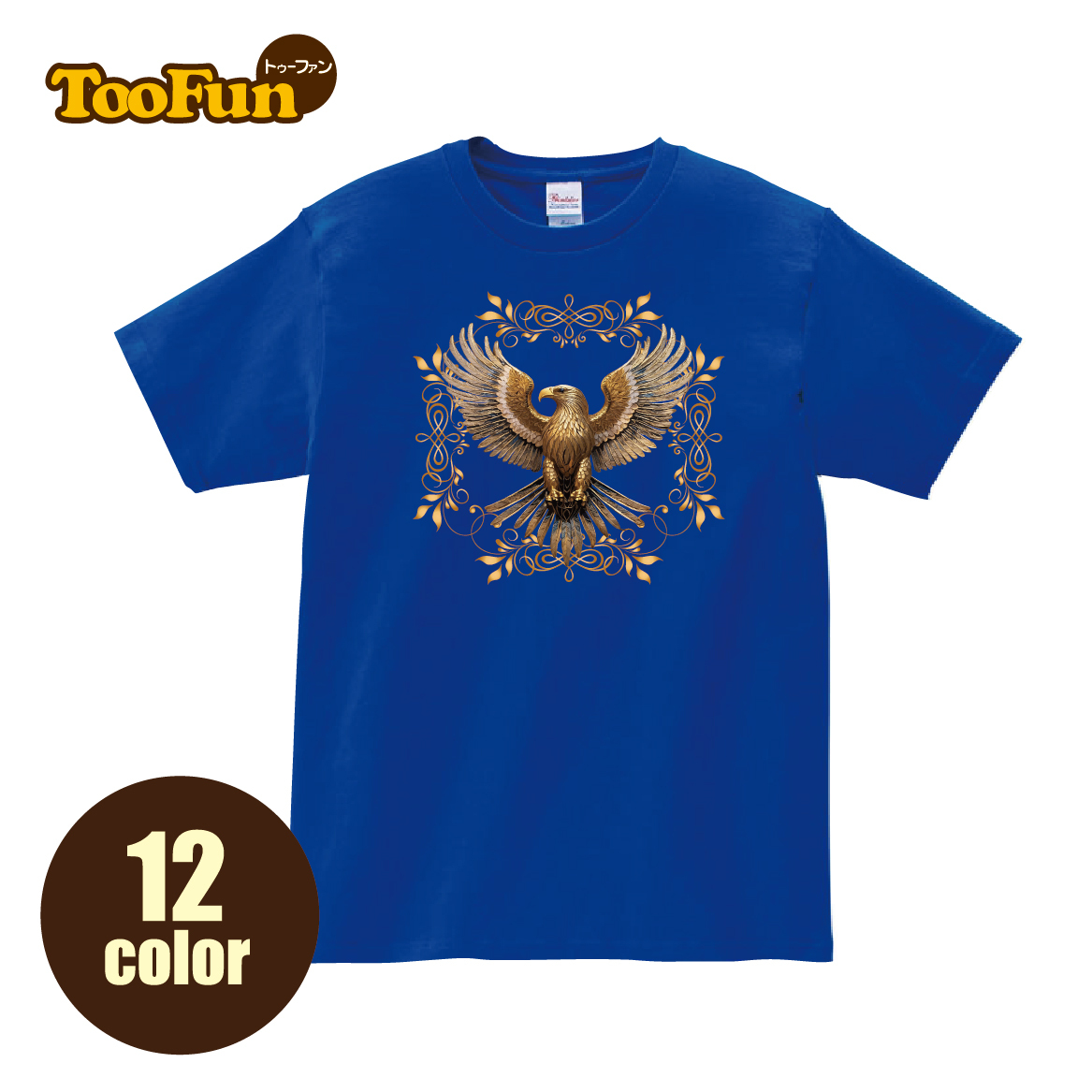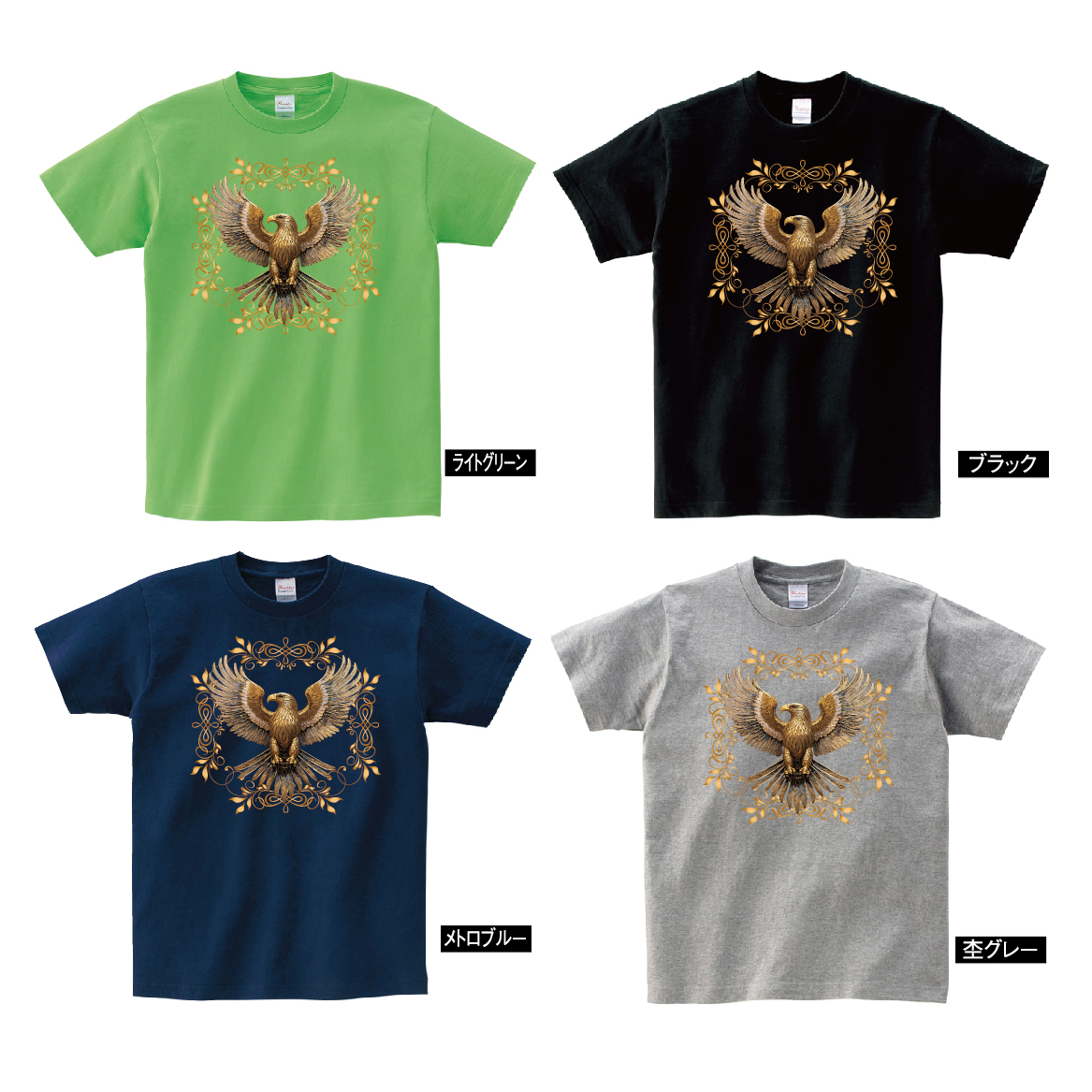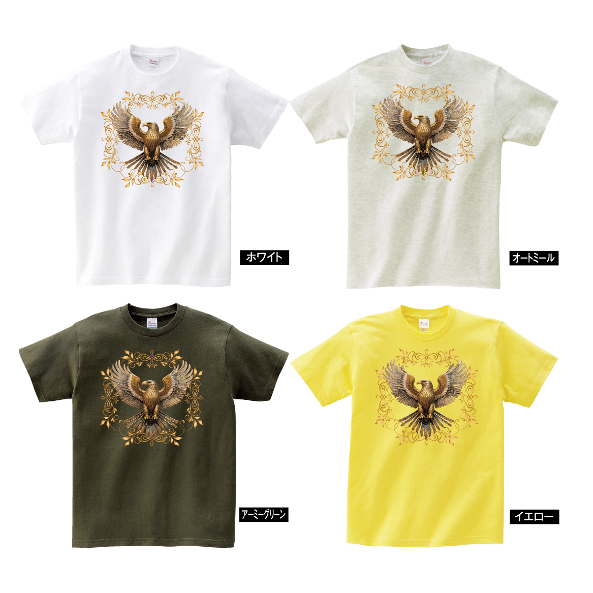 このTシャツは、アメリカの国鳥である鷲をモチーフにしたオリジナルデザインが特徴です。金色で描かれた鷲のデザインは、刺繍のような繊細な風合いを持ち、着る人の存在感を際立たせます。豊富な12色のカラーバリエーションから選べるため、自分のスタイルに合わせてお選びいただけます。厚手の綿100%素材を使用しているため、耐久性に優れ、長時間の着用でも快適さを保ちます。カジュアルな日常着としてはもちろん、アウトドアやスポーツシーンでも活躍する一枚です。このTシャツは、デザイン性と実用性を兼ね備え、どんな場面でも自信を持って着用できるアイテムです。