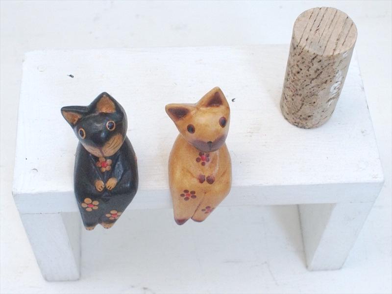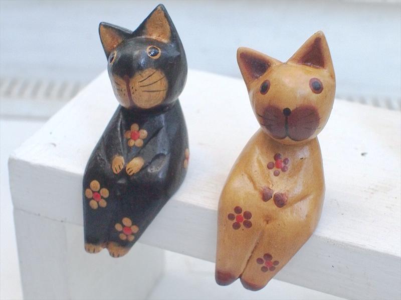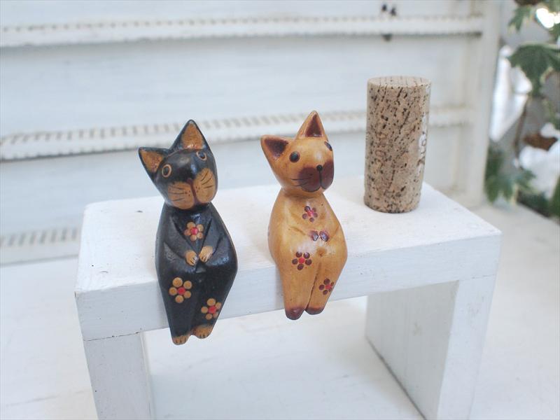 バリ島面白木彫り*ちっちゃなミニ腰掛けタイプ・花柄・茶と黒二匹セット・B☆飾り置物癒しインテリアアニマル