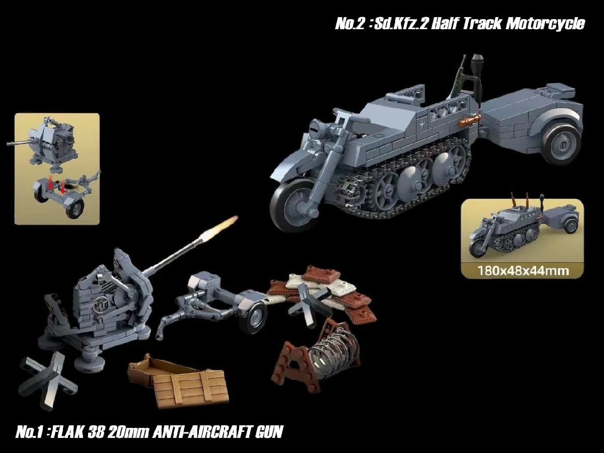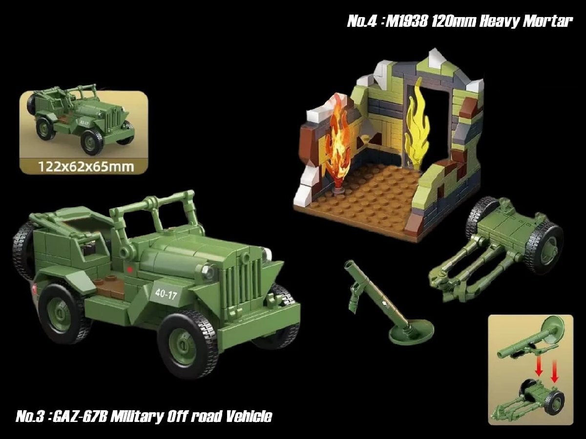 商品説明 ITEM INFO 戦場を彩る高射砲や迫撃砲などがセットになったジオラマセット AFM ヒーロズ&ジェネラルズ゛シリーズ 高射砲/ハーフトラック/オフロード車/重迫撃砲 1108Blocksです。 楽しく組み立てて、カッコよく飾れるAFM ブロックシリーズです。 WW2時代を象徴する迫撃砲や高射砲などがセットになったジオラマ風セット。ドイツ軍 Flak 38 高射砲とトレーラーセット、軌道式オートバイ ケッテンクラートSd.Kfz 2、ソ連のジープ対抗馬 GAZ-67B、砲身旋回ができる画期的な重迫 M1938 120mm迫撃砲の4つがセットになっています。 それぞれのモデルは250ブロック前後で手軽に組み立てることができます。またそれぞれにミニフィギュアと、携帯武器がセットになっており、よりリアルな戦場を再現することが可能です。 楽しく作れてインテリアとしてもグッド!ミリタリーマニアやブロック好きな方に是非! 商品基本情報・スペック ITEM SPEC ●商品名 : AFM ヒーロズ&ジェネラルズ゛シリーズ 高射砲/ハーフトラック/オフロード車/重迫撃砲 1108Blocks ●商品番号 : M0033S ●ブランド : AFM ●パッケージサイズ : 312mm×223mm×210mm ●素材 : ABS ●総ブロック数 : 1108 ●対象年齢 : 15歳以上 注意事項 ITEM NOTE ∇商品固有の注意事項 ※小さなブロックが多く含まれています。誤って飲み込まないようにご注意ください。窒息などの危険があります。 ※誤飲の危険がありますので対象年齢を守り、小さなお子様だけでは絶対に遊ばせないでください。 ※当商品はレゴ(LEGO)商品ではございません。 ※弊社取扱商品以外への互換性はありませんのでご了承ください。 ※梱包は製品外箱に透明の緩衝材を巻いた簡易包装です。 ∇ご購入時の留意事項 ※商品はすべて点検してからのお届けになります。商品によってはパッケージの開封等を行う場合もございますことをご了承ください。 ※商品には万全を記しておりますが、万一不備な点がございましたら、お手数ですがお問い合わせフォームにてご連絡頂ますようお願い致します。なお、海外製品につきましては、輸入時についた若干の傷、痛み等が見られる場合がございます。 国内製品のような完全品をお求めの方はご遠慮下さい。 ※商品が適合外であった場合、またはお客様都合による交換・返品・返金は出来ません。よくお確かめの上、ご購入下さい。 ※モニター環境により、実際の商品の色と若干異なる場合がございますのでご了承下さい。 ※他サイトでも同時販売の為売り切れの際はご了承下さい。 ※売り切れの際は早急にご連絡させて頂きます。(当社休業日を除く) 関連商品 RELATED ITEM