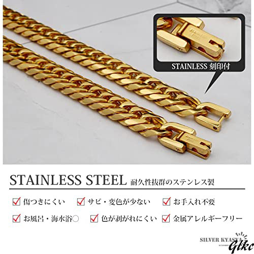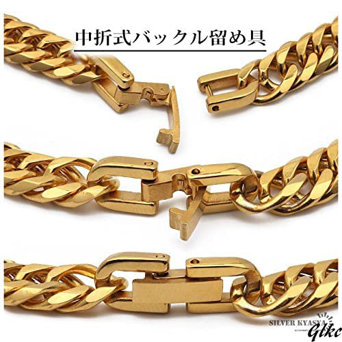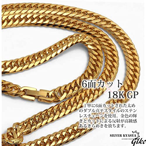 特に目を引くのは、密度の濃いダブル喜平チェーンと、6面カット仕上げにより美しい輝きを放つ18Kゴールドメッキ。