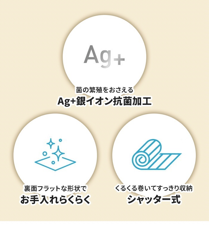 | ・Ag+銀イオン抗菌加工、防カビ加工 ・くるくる巻いて簡単収納・溝に沿ってお掃除らくらく ・耐熱温度:100度 ・お年よりやお子さまにも優しい軽さ。(軽量タイプ) ・生産物賠償保険付(PL保険) ・国内生産品 |
