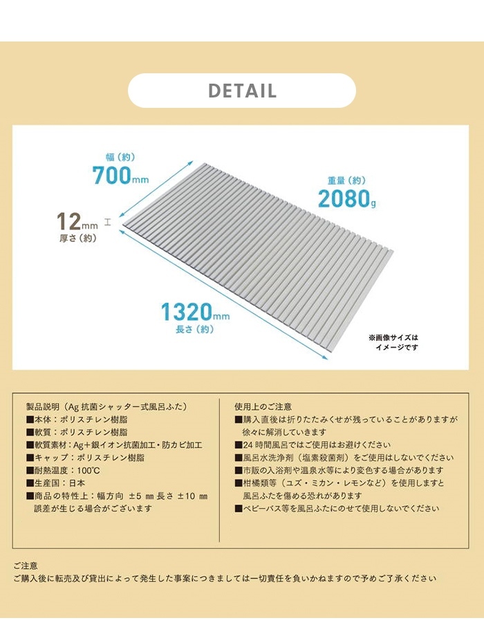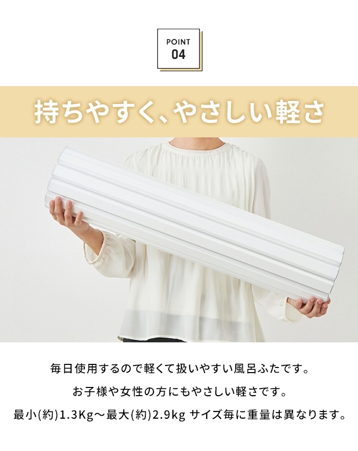 | Ag抗菌シャッター式 風呂ふた。 〔POINT〕Ag抗菌加工&防カビ加工 繋ぎ目にAg+銀イオン抗菌加工が施してあり、菌やカビによる嫌なヌメリの繁殖を抑えて風呂ふたをきれいに保ちます。 〔POINT〕毎日のお風呂掃除が簡単に 表面の溝に沿って軽く洗って水を流せばお掃除完了。 (風呂ふたを洗う際は柔らかいスポンジや中性浴室用洗剤を使用してください。) 〔POINT〕くるくる巻いてすっきり収納 浴室にひろげている風呂ふたをくるくる巻くだけのシャッタータイプ。 クルッとまとめられるので収納スペースが少ないお風呂場にぴったり。 〔POINT〕軽量設計 毎日使うものだから軽量でストレスフリーな使い心地。 軽量なのでお子様からお年寄りの方でも簡単に扱えます。 〔POINT〕安心・安全の日本製。 【使用上のご注意】 ◎購入直後は折りたたみクセが残っていることがありますが、徐々に解消していきます。 ◎24時間風呂ではご使用をお避け下さい。 ◎風呂水洗浄剤(塩素殺菌剤)をご使用しないでください。 ◎柑橘類(柚子・みかん・レモンなど)を使用しますと風呂ふたを傷める恐れがあります。 ◎ベビーバスなどを風呂ふたに乗せて使用しないでください。 |