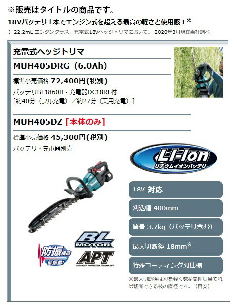 マキタ makita充電式ヘッジトリマMUH405DZ本体のみです。※バッテリ・充電器は別販売品です。■18Vバッテリ1本でエンジン式を超える最高の軽さと使用感!※ 22.2mL エンジンクラス、充電式18Vヘッジトリマにおいて。2018年3月現在マキタ社調べ88381728768
