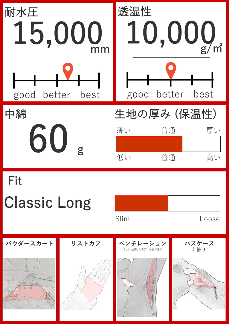 ・耐水圧:15,000mm ・透湿性:10,000g ・中綿: ボディ:60g / フードと袖:40g ・フルシーム加工 ・背中部分にホッカイロポケット ・ジップ付きチェストポケット ・クラシックロングフィット ・ウェストのパウダーガード:あり ・手首部分のカフ:あり ・脇の下のベンチレーション:あり ・パスケース:あり(袖) ・生地の厚さ:ふつう |